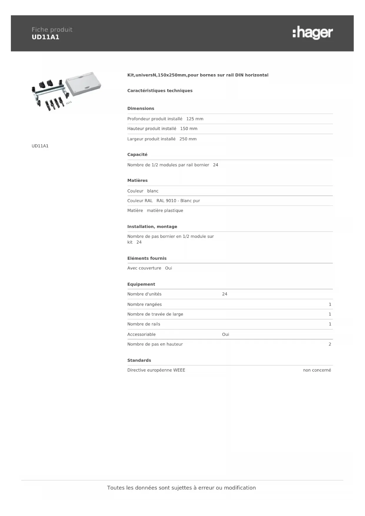 UD11A1 UD11A1 Kit,universN,150x250mm,pour bornes sur rail DIN horizontal Caractéristiques techniques Dimensions Profondeur produit installé 125 mm Hauteur produit installé 150 mm Largeur produit installé 250 mm Capacité Nombre de 1/2 modules par rail bornier 24 Matières Couleur blanc Couleur RAL RAL 9010 - Blanc pur Matière matière plastique Installation, montage Nombre de pas bornier en 1/2 module sur kit 24 Eléments fournis Avec couverture Oui Equipement Nombre d'unités 24 Nombre rangées 1 Nombre de travée de large 1 Nombre de rails 1 Accessoriable Oui Nombre de pas en hauteur 2 Standards Directive européenne WEEE non concerné Toutes les données sont sujettes à erreur ou modification