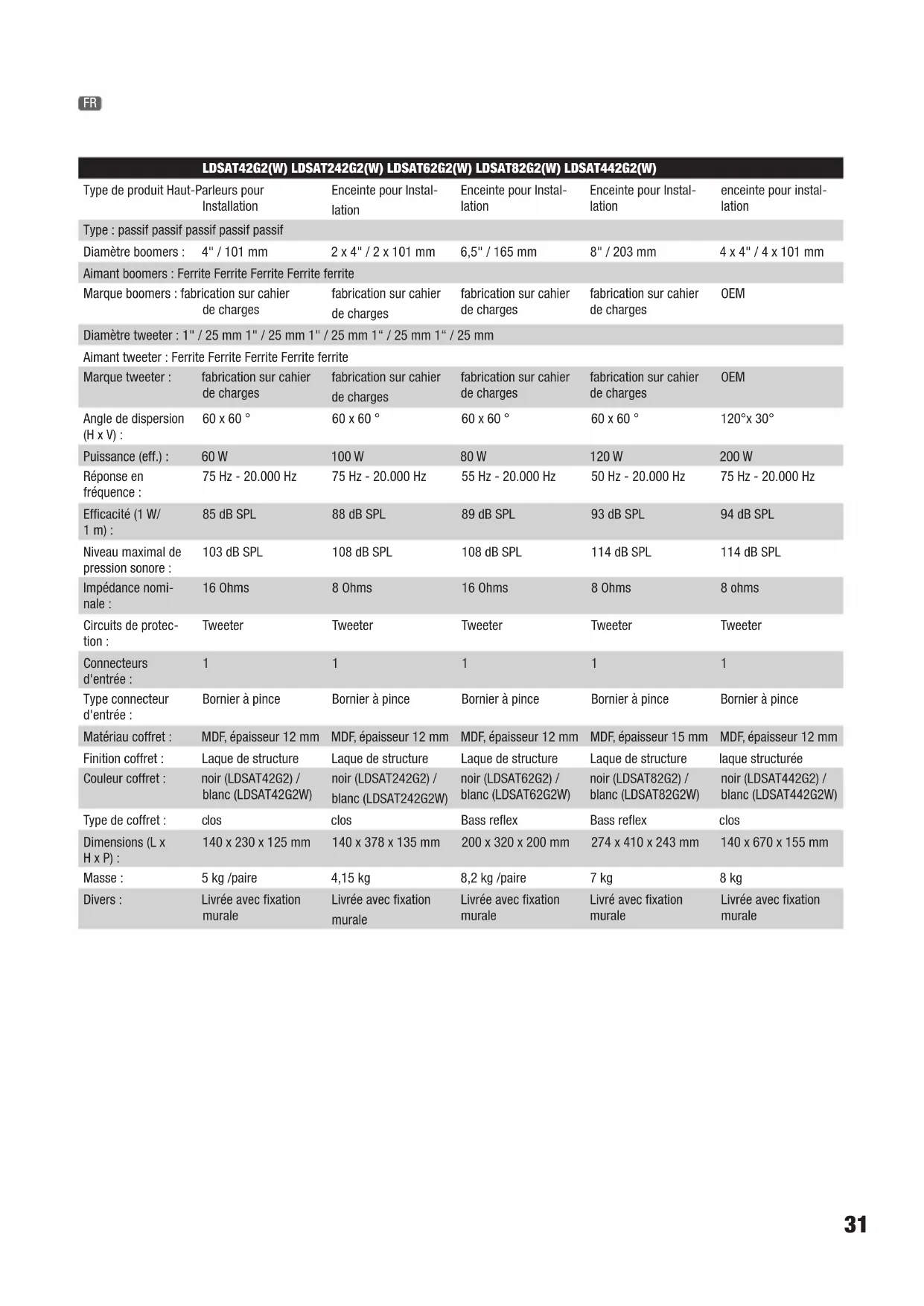 LDSAT42G2(W) LDSAT242G2(W) LDSAT62G2(W) LDSAT82G2(W) LDSAT442G2(W) Type de produit Haut-Parleurs pour Installation Enceinte pour Instal- lation Enceinte pour Instal- lation Enceinte pour Instal- lation enceinte pour instal- lation Type : passif passif passif passif passif Diamètre boomers : 4" / 101 mm 2 x 4" / 2 x 101 mm 6,5" / 165 mm 8" / 203 mm 4 x 4" / 4 x 101 mm Aimant boomers : Ferrite Ferrite Ferrite Ferrite ferrite Marque boomers : fabrication sur cahier de charges fabrication sur cahier de charges fabrication sur cahier de charges fabrication sur cahier de charges OEM Diamètre tweeter : 1" / 25 mm 1" / 25 mm 1" / 25 mm 1“ / 25 mm 1“ / 25 mm Aimant tweeter : Ferrite Ferrite Ferrite Ferrite ferrite Marque tweeter : fabrication sur cahier de charges fabrication sur cahier de charges fabrication sur cahier de charges fabrication sur cahier de charges OEM Angle de dispersion (H x V) : 60 x 60 ° 60 x 60 ° 60 x 60 ° 60 x 60 ° 120°x 30° Puissance (eff.) : 60 W 100 W 80 W 120 W 200 W Réponse en fréquence : 75 Hz - 20.000 Hz 75 Hz - 20.000 Hz 55 Hz - 20.000 Hz 50 Hz - 20.000 Hz 75 Hz - 20.000 Hz Efficacité (1 W/ 1 m) : 85 dB SPL 88 dB SPL 89 dB SPL 93 dB SPL 94 dB SPL Niveau maximal de pression sonore : 103 dB SPL 108 dB SPL 108 dB SPL 114 dB SPL 114 dB SPL Impédance nomi- nale : 16 Ohms 8 Ohms 16 Ohms 8 Ohms 8 ohms Circuits de protec- tion : Tweeter Tweeter Tweeter Tweeter Tweeter Connecteurs d'entrée :