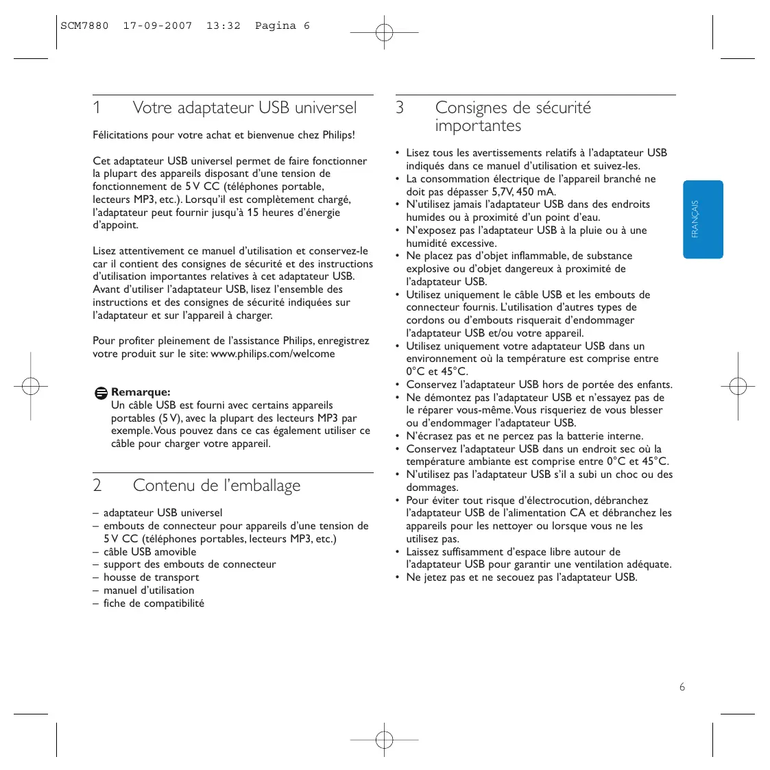 Lisez attentivement ce manuel d'utilisation et conserveze-le car il contient des consignes de sécurité et des instructions d'utilisation importantes relatives à cet adaptateur USB. Avant d'utiliser l'adaptateur USB, liquez l'ensemble des instructions et des consignes de sécurité indiquées sur l'adaptateur et sur l'appareil à charger.