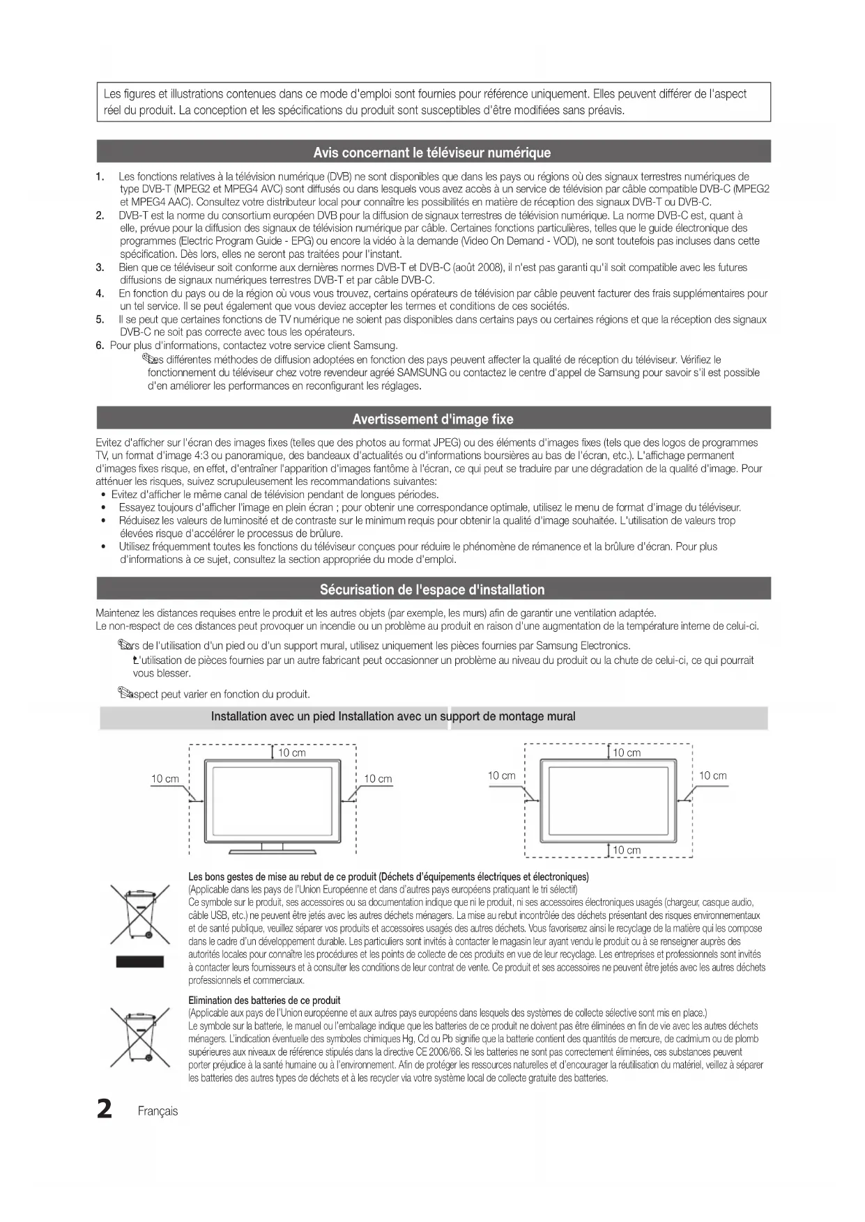 L'aspect peut varier en fonction du produit. Installation avec un pied Installation avec un support de montage mural Les bons gestes de mise au rebut de ce produit (Déchets d’équipements électriques et électroniques) (Applicable dans les pays de l’Union Européenne et dans d’autres pays européens pratiquant le tri sélectif) Ce symbole sur le produit, ses accessoires ou sa documentation indique que ni le produit, ni ses accessoires électroniques usagés (chargeur, casque audio, câble USB, etc.) ne peuvent être jetés avec les autres déchets ménagers. La mise au rebut incontrôlée des déchets présentant des risques environnementaux et de santé publique, veuillez séparer vos produits et accessoires usagés des autres déchets. Vous favoriserez ainsi le recyclage de la matière qui les compose dans le cadre d’un développement durable. Les particuliers sont invités à contacter le magasin leur ayant vendu le produit ou à se renseigner auprès des autorités locales pour connaître les procédures et les points de collecte de ces produits en vue de leur recyclage. Les entreprises et professionnels sont invités à contacter leurs fournisseurs et à consulter les conditions de leur contrat de vente. Ce produit et ses accessoires ne peuvent être jetés avec les autres déchets professionnels et commerciaux. Elimination des batteries de ce produit (Applicable aux pays de l’Union européenne et aux autres pays européens dans lesquels des systèmes de collecte sélective sont mis en place.) Le symbole sur la batterie, le manuel ou l’emballage indique que les batteries de ce produit ne doivent pas être éliminées en fin de vie avec les autres déchets ménagers. L’indication éventuelle des symboles chimiques Hg, Cd ou Pb signifie que la batterie contient des quantités de mercure, de cadmium ou de plomb supérieures aux niveaux de référence stipulés dans la directive CE 2006/66. Si les batteries ne sont pas correctement éliminées, ces substances peuvent porter préjudice à la santé humaine ou à l’environnement. Afin de protéger les ressources naturelles et d’encourager la réutilisation du matériel, veillez à séparer les batteries des autres types de déchets et à les recycler via votre système local de collecte gratuite des batteries. 10 cm 10 cm 10 cm 10 cm 10 cm 10 cm 10 cm [UC6500_XC]BN68-02694A-00L06.indb 2 2010-02-26 오후 11:57:283 FRANÇAIS Français Vérifiez la présence du symbole!