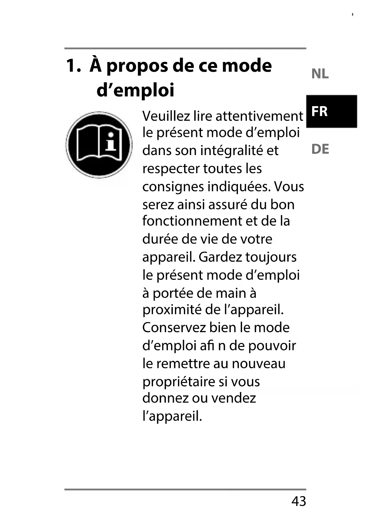 d’emploi Veuillez lire attentivement le présent mode d’emploi dans son intégralité et respecter toutes les consignes indiquées. Vous serez ainsi assuré du bon fonctionnement et de la durée de vie de votre appareil. Gardez toujours le présent mode d’emploi à portée de main à proximité de l’appareil. Conservez bien le mode d’emploi a n de pouvoir le remettre au nouveau propriétaire si vous donnez ou vendez l’appareil.44 1.1. Symboles et avertisse- ments utilisés dans ce mode d’emploi DANGER ! Avertissement d’un risque vital immédiat ! AVERTISSEMENT ! Avertissement d’un risque vital possible et/ou de blessures graves irréversibles! PRUDENCE! Avertissement d’un risque possible de blessures moyennes à légères !45
