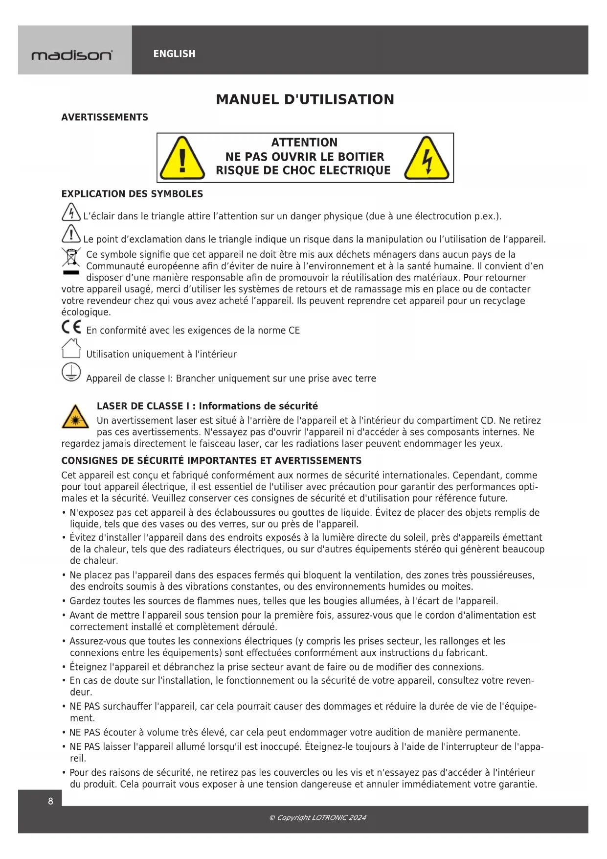 L’éclair dans le triangle attire l’attention sur un danger physique (due à une électrocution p.ex.). Le point d’exclamation dans le triangle indique un risque dans la manipulation ou l’utilisation de l’appareil. Ce symbole signie que cet appareil ne doit être mis aux déchets ménagers dans aucun pays de la Communauté européenne an d’éviter de nuire à l’environnement et à la santé humaine. Il convient d’en disposer d’une manière responsable an de promouvoir la réutilisation des matériaux. Pour retourner votre appareil usagé, merci d’utiliser les systèmes de retours et de ramassage mis en place ou de contacter votre revendeur chez qui vous avez acheté l’appareil. Ils peuvent reprendre cet appareil pour un recyclage écologique. En conformité avec les exigences de la norme CE Utilisation uniquement à l'intérieur Appareil de classe I: Brancher uniquement sur une prise avec terre LASER DE CLASSE I : Informations de sécurité Un avertissement laser est situé à l'arrière de l'appareil et à l'intérieur du compartiment CD. Ne retirez pas ces avertissements. N'essayez pas d'ouvrir l'appareil ni d'accéder à ses composants internes. Ne regardez jamais directement le faisceau laser, car les radiations laser peuvent endommager les yeux. CONSIGNES DE SÉCURITÉ IMPORTANTES ET AVERTISSEMENTS Cet appareil est conçu et fabriqué conformément aux normes de sécurité internationales. Cependant, comme pour tout appareil électrique, il est essentiel de l'utiliser avec précaution pour garantir des performances opti- males et la sécurité. Veuillez conserver ces consignes de sécurité et d'utilisation pour référence future.
