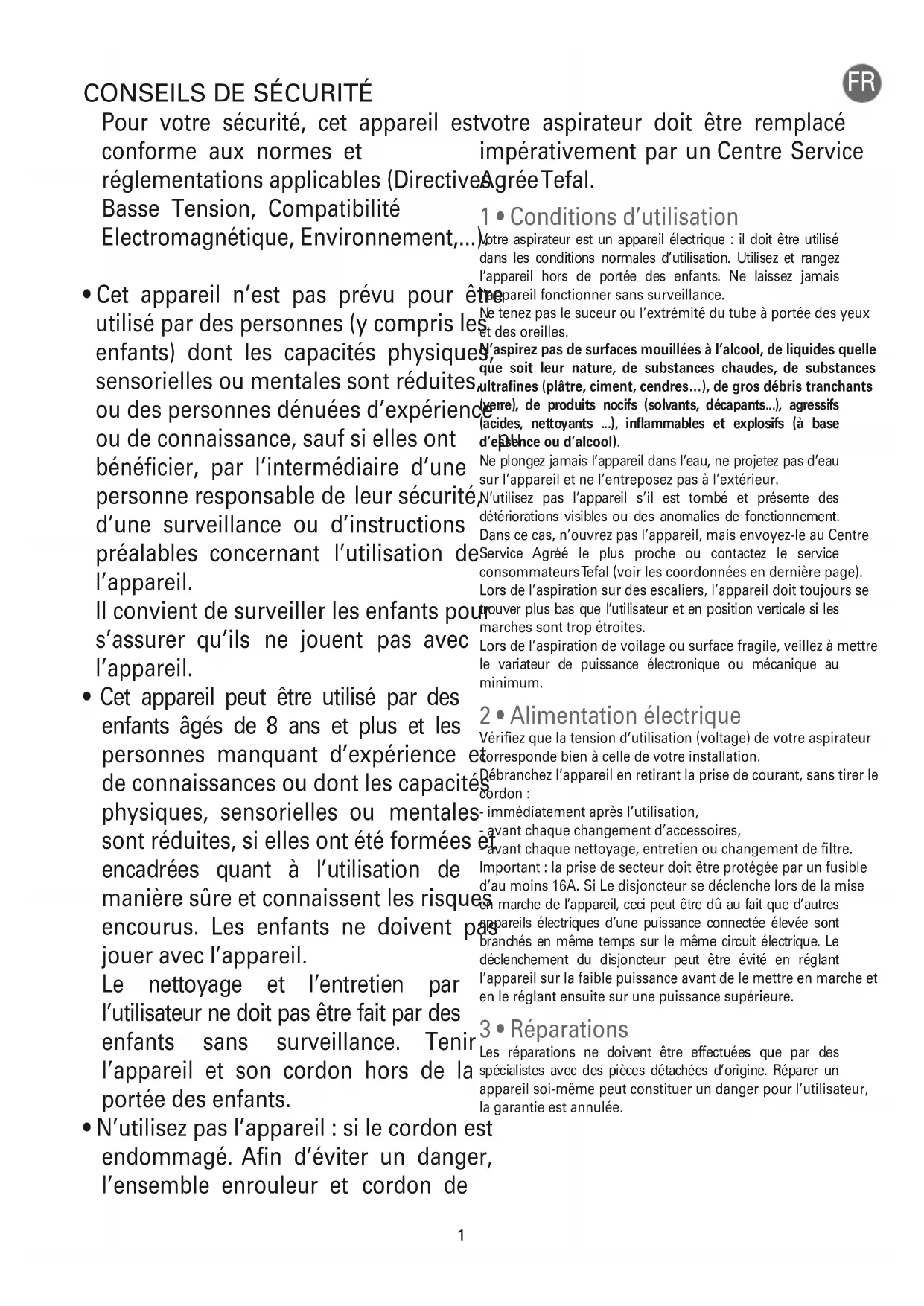 - N’utilisez pas l’appareil : si le cordon est endommagé. Afin d’éviter un danger, l’ensemble enrouleur et cordon de votre aspirateur doit être remplacé impérativement par un Centre Service Agrée Tefal. 1 • Conditions d’utilisation