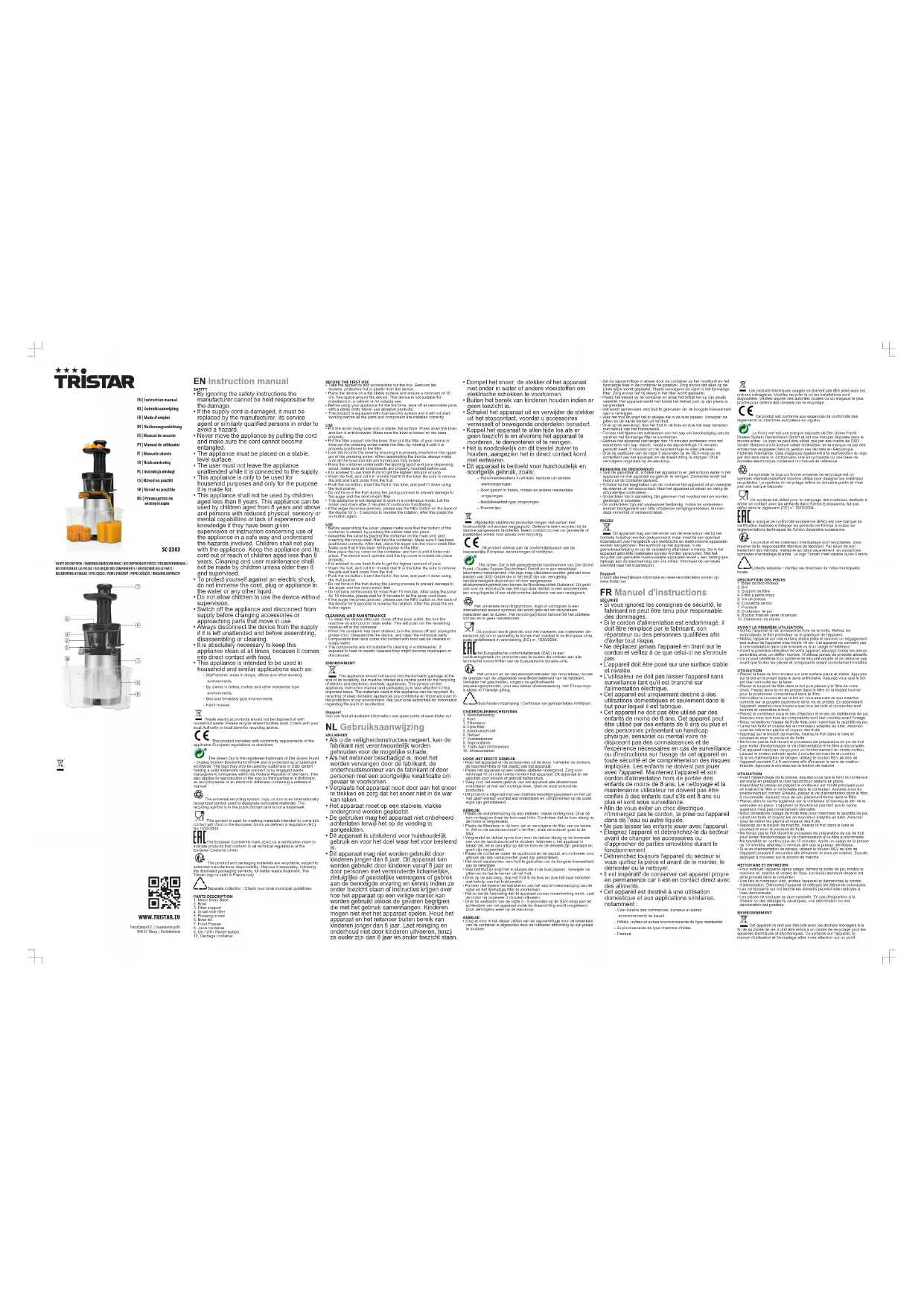 SC2303 - Extracteur de jus TRISTAR - Notice d'utilisation et mode d'emploi gratuit