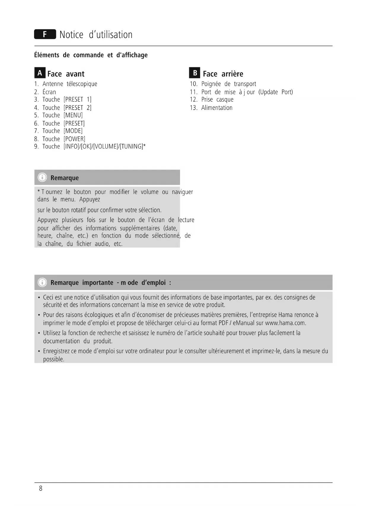 Downloads.8 F Notice d’utilisation Éléments de commande et d'affichage Remarque *Tournez le bouton pour modier le volume ou naviguer dans le menu. Appuyez sur le bouton rotatif pour conrmer votresélection. Appuyez plusieurs fois sur le bouton de l’écran de lecture pour acher des informations supplémentaires (date, heure, chaîne, etc.) en fonction du mode sélectionné, de la chaîne, du chier audio, etc. Remarque importante -mode d’emploi :
