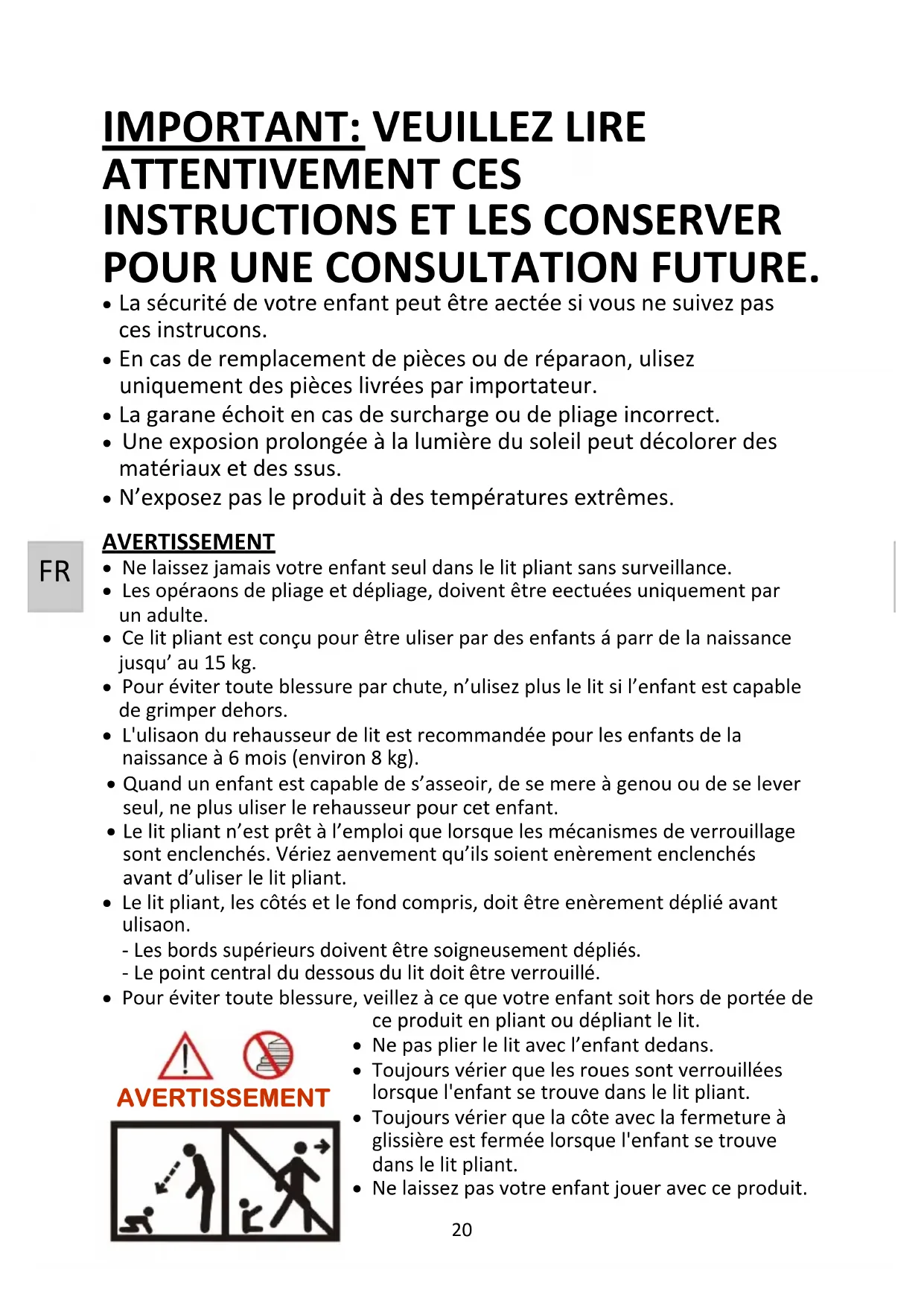 Le lit pliant n’est prêt à l’emploi que lorsque les mécanismes de verrouillage sont enclenchés. Vérifiez attentivement qu’ils soient entièrement enclenchés avant d’utiliser le lit pliant. Le lit pliant, les côtés et le fond compris, doit être entièrement déplié avant utilisation. - Les bords supérieurs doivent être soigneusement dépliés. - Le point central du dessous du lit doit être verrouillé. Pour éviter toute blessure, veillez à ce que votre enfant soit hors de portée de ce produit en pliant ou dépliant le lit. Ne pas plier le lit avec l’enfant dedans. Toujours vérifier que les roues sont verrouillées lorsque l'enfant se trouve dans le lit pliant. Toujours vérifier que la côte avec la fermeture à glissière est fermée lorsque l'enfant se trouve dans le lit pliant. Ne laissez pas votre enfant jouer avec ce produit. AVERTISSEMENT FR21