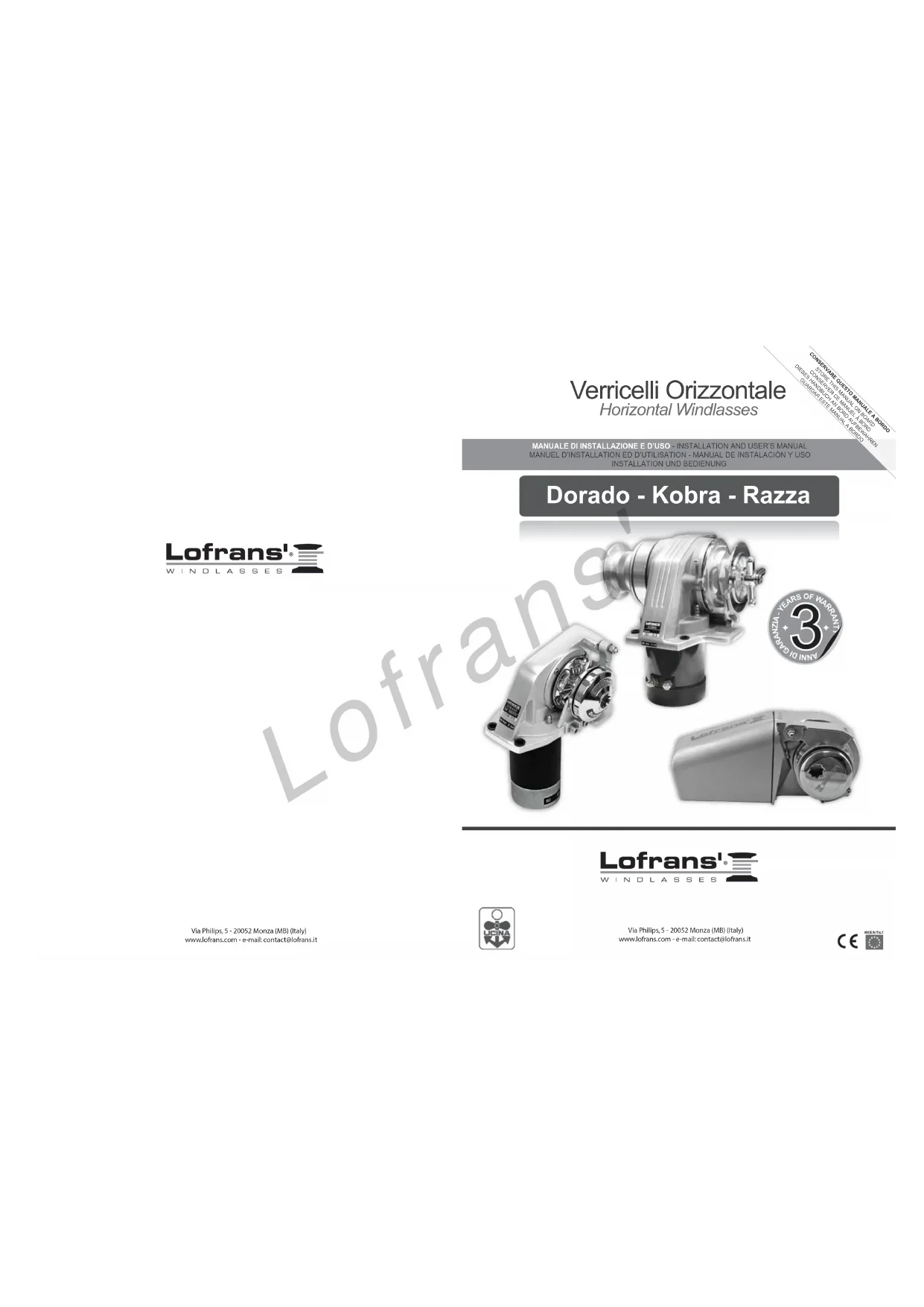 - La responsabilité de Lofrans s.r.l. se limite à réparer ou remplacer les parties du produit qui présentent des défauts de matériau ou de fabrication. - Lofrans s.r.l n’assumera aucune responsabilité en cas de guindeau mal choisi par l’acheteur. - Lofrans s.r.l ne sera en aucune manière responsable des pannes ou des détériorations dérivant de : - l’emploi du guindeau pour une application différente de celle pour laquelle il a été conçu ou prévu; - corrosion, dégradation due aux rayons ultra-violets et usure; - la non observation du plan d’entretien; - une mauvaise installation ou non appropriée du produit ; - toutes modifications ou manipulations du produit; - une utilisation poussée par rapport aux spécificités et performances du produit - Sauf directives diverses directement données par Lofrans s.r.l. 12 GARANTIEBEDINGUNGEN Unter der Voraussetzung, dass die Ankerwinde normal eingesetzt und der Wartungsplan eingehalten wird, gewährt das Unternehmen Lofrans s.r.l. einen Garantiezeitraum von 3 Jahren ab Kaufdatum durch den Endkunden, vorbehaltlich der nachstehende aufgelisteten Bedingungen, Einschränkungen und Ausnahmen. Jedes Produkt, das während dieses Zeitraums bei normalem Einsatz Mängel aufweist, wird nach Entscheidung der Lofrans s.r.l. entweder repariert oder ausgetauscht.