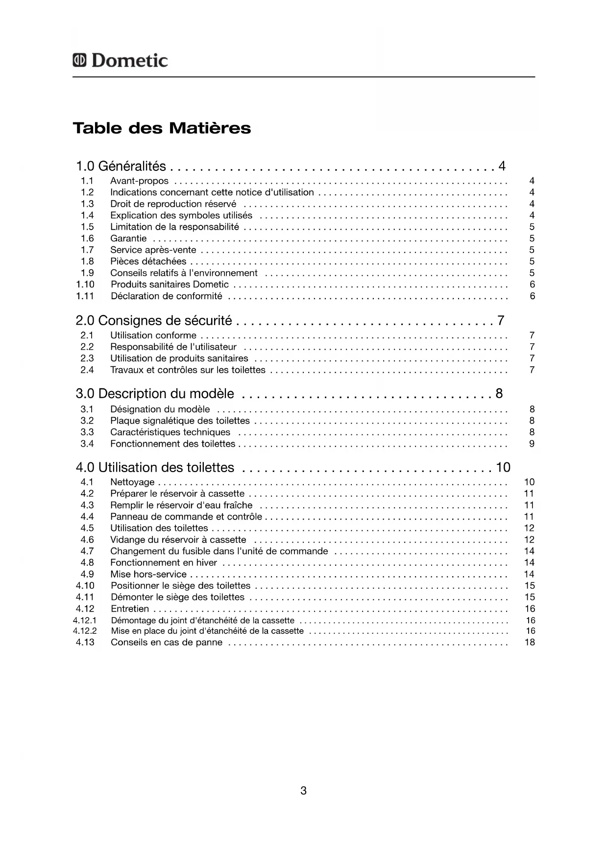 Numéro du modèle .............................................Numéro du produit.............................................Numéro de série .............................................Veuillez noter les données suivantes :MBA 09/2011 N 1 Français2 CT 4050 CTS 4110 CTW 4110 CT 4110 CTLP 4110 CTS 4050 CTW 4050 CTLP 4050 © Dometic GmbH - 2011 - Sous réserve de modifications Dometic GmbH In der Steinwiese 16 D-57074 Siegen www.dometic.com1.0 Généralités . . . . . . . . . . . . . . . . . . . . . . . . . . . . . . . . . . . . . . . . . . . . 4 1.1 Avant-propos . . . . . . . . . . . . . . . . . . . . . . . . . . . . . . . . . . . . . . . . . . . . . . . . . . . . . . . . . . . . . . . 4 1.2 Indications concernant cette notice d'utilisation . . . . . . . . . . . . . . . . . . . . . . . . . . . . . . . . . . . . 4 1.3 Droit de reproduction réservé . . . . . . . . . . . . . . . . . . . . . . . . . . . . . . . . . . . . . . . . . . . . . . . . . . 4 1.4 Explication des symboles utilisés . . . . . . . . . . . . . . . . . . . . . . . . . . . . . . . . . . . . . . . . . . . . . . . 4 1.5 Limitation de la responsabilité . . . . . . . . . . . . . . . . . . . . . . . . . . . . . . . . . . . . . . . . . . . . . . . . . . 5 1.6 Garantie . . . . . . . . . . . . . . . . . . . . . . . . . . . . . . . . . . . . . . . . . . . . . . . . . . . . . . . . . . . . . . . . . . . 5 1.7 Service après-vente . . . . . . . . . . . . . . . . . . . . . . . . . . . . . . . . . . . . . . . . . . . . . . . . . . . . . . . . . . 5 1.8 Pièces détachées . . . . . . . . . . . . . . . . . . . . . . . . . . . . . . . . . . . . . . . . . . . . . . . . . . . . . . . . . . . . 5 1.9 Conseils relatifs à l'environnement . . . . . . . . . . . . . . . . . . . . . . . . . . . . . . . . . . . . . . . . . . . . . . 5 1.10 Produits sanitaires Dometic . . . . . . . . . . . . . . . . . . . . . . . . . . . . . . . . . . . . . . . . . . . . . . . . . . . . 6 1.11 Déclaration de conformité . . . . . . . . . . . . . . . . . . . . . . . . . . . . . . . . . . . . . . . . . . . . . . . . . . . . . 6