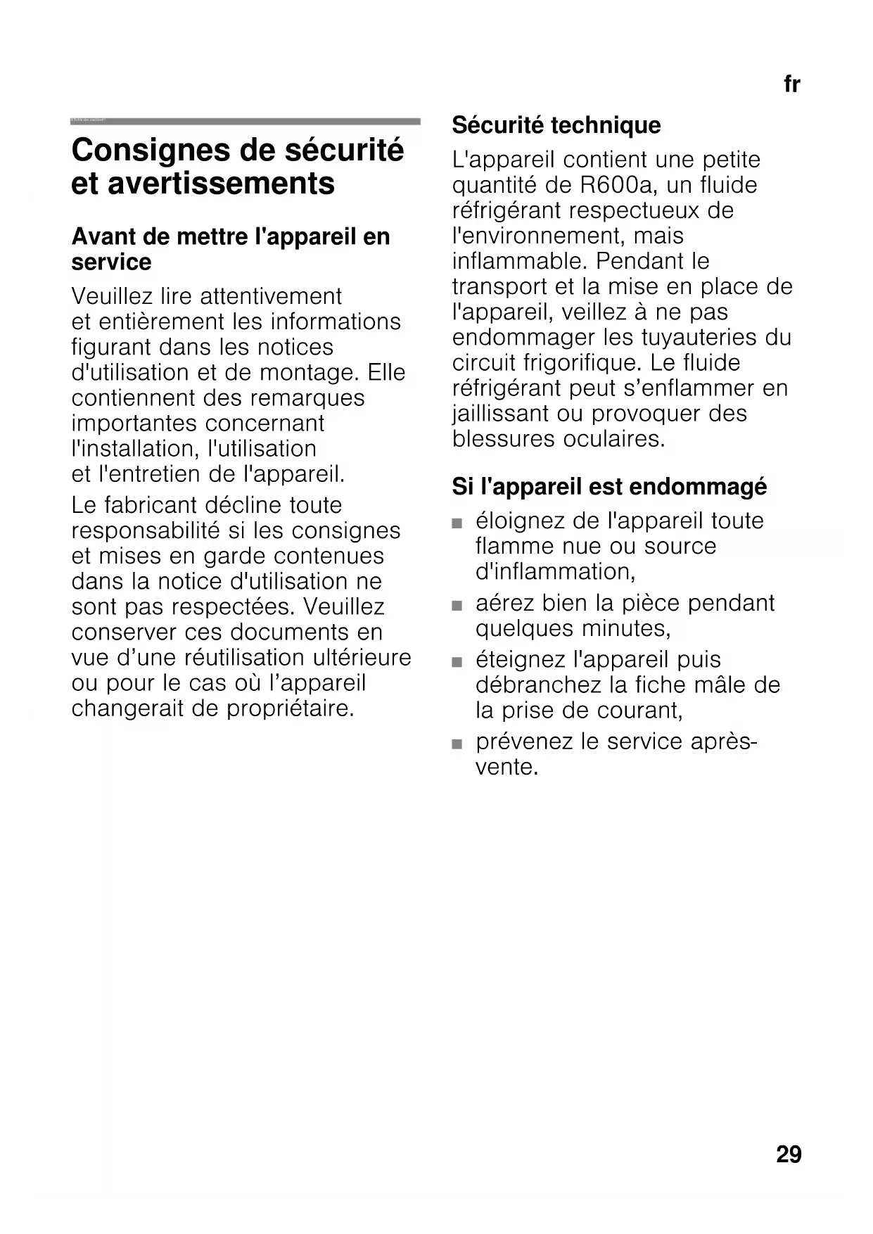 frTable des matières frMode d’emploi Consignes de sécurité et avertissements Avant de mettre l'appareil en service Veuillez lire attentivement et entièrement les informations figurant dans les notices d'utilisation et de montage. Elle contiennent des remarques importantes concernant l'installation, l'utilisation et l'entretien de l'appareil. Le fabricant décline toute responsabilité si les consignes et mises en garde contenues dans la notice d'utilisation ne sont pas respectées. Veuillez conserver ces documents en vue d’une réutilisation ultérieure ou pour le cas où l’appareil changerait de propriétaire. Sécurité technique L'appareil contient une petite quantité de R600a, un fluide réfrigérant respectueux de l'environnement, mais inflammable. Pendant le transport et la mise en place de l'appareil, veillez à ne pas endommager les tuyauteries du circuit frigorifique. Le fluide réfrigérant peut s’enflammer en jaillissant ou provoquer des blessures oculaires. Si l'appareil est endommagé ■ éloignez de l'appareil toute flamme nue ou source d'inflammation, ■ aérez bien la pièce pendant quelques minutes, ■ éteignez l'appareil puis débranchez la fiche mâle de la prise de courant, ■ prévenez le service après- vente.fr