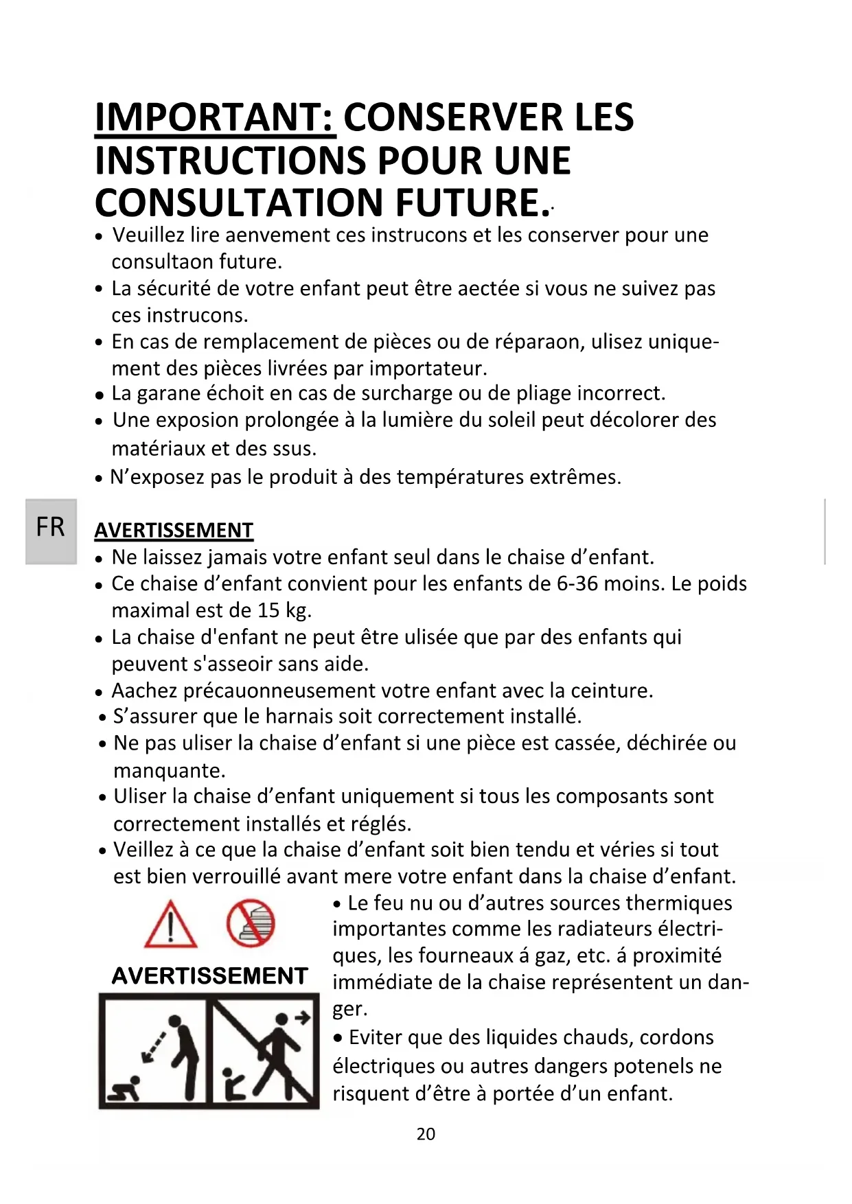 Ne laissez pas votre enfant jouer avec ce produit. Ne laissez pas l’enfant debout dans la chaise d’enfant ou sur le repose- pieds. Ne déposez rien sur le plateau, cela pourrait rendre la chaise d’enfant instable. N’installez jamais plus de 1 enfant dans la chaise d’enfant. N’utilisez pas de pièces de rechange ou d’accessoires autres que ceux recommandés par le manuel d’instruction. Ne pas user d’accessoires non approuvées par le fabricante. User seulement les pièces de rechange fournis ou approuvées par le fabricante/ distributeur. Veillez à ce qu’il n’y ait pas d’enfants, d’animaux et d’objets en dessous ou à proximité de la chaise lorsqu’un enfant est assis dedans. Pour le confort de votre enfant, prévoyez toujours assez d’espace entre l’enfant et le plateau. A lui seul, le plateau ne suffit pas pour garantir la sécurité de votre enfant, utilisez TOUJOURS la ceinture de sécurité à 5 points. Le produit doit être monté uniquement par un adulte. Ne mettez pas la chaise d’enfant à proximité d’escaliers ou de marches. Vérifiez que les pièces suivantes se trouvent bien dans la boite: