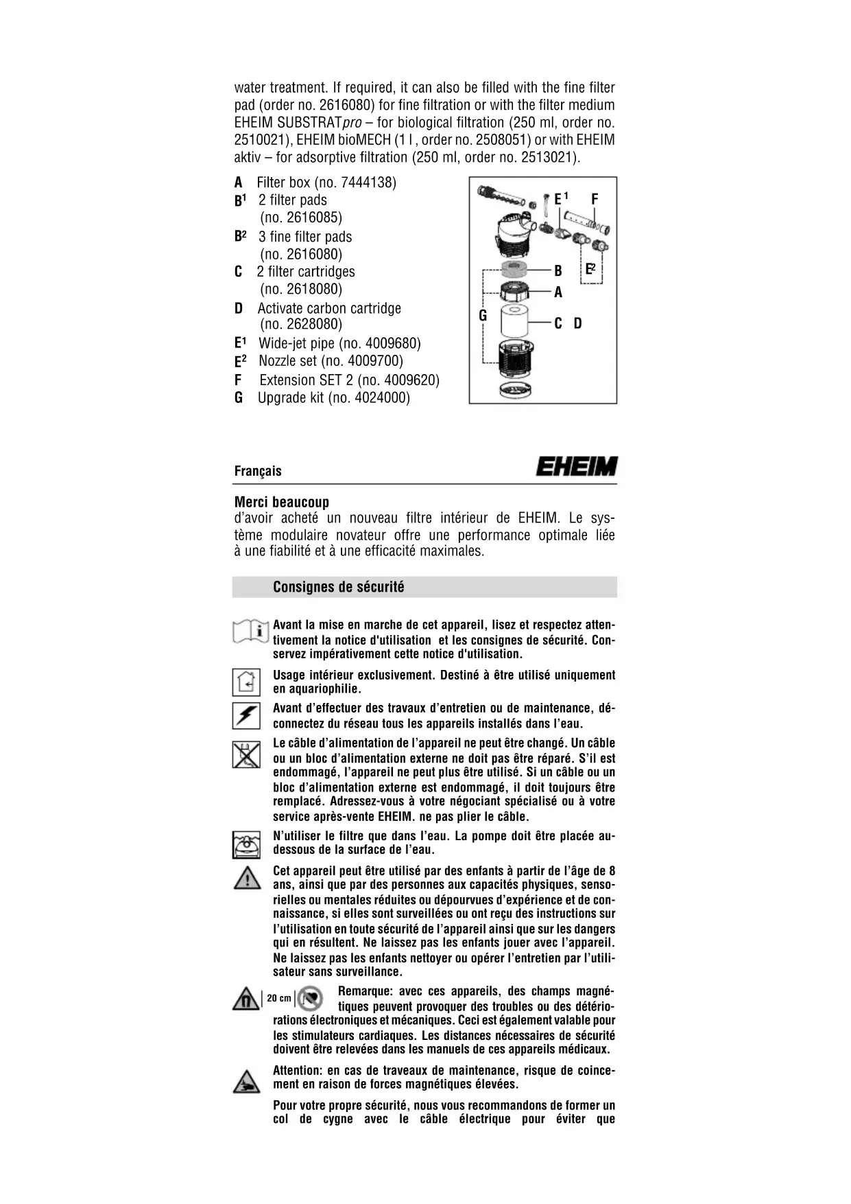 Avant la mise en marche de cet appareil, lisez et respectez atten- tivement la notice d'utilisation et les consignes de sécurité. Con- servez impérativement cette notice d'utilisation. Usage intérieur exclusivement. Destiné à être utilisé uniquement en aquariophilie. Avant d’effectuer des travaux d’entretien ou de maintenance, dé- connectez du réseau tous les appareils installés dans l’eau. Le câble d’alimentation de l’appareil ne peut être changé. Un câble ou un bloc d’alimentation externe ne doit pas être réparé. S’il est endommagé, l’appareil ne peut plus être utilisé. Si un câble ou un bloc d’alimentation externe est endommagé, il doit toujours être remplacé. Adressez-vous à votre négociant spécialisé ou à votre service après-vente EHEIM. ne pas plier le câble. N’utiliser le filtre que dans l’eau. La pompe doit être placée au- dessous de la surface de l’eau. Cet appareil peut être utilisé par des enfants à partir de l’âge de 8 ans, ainsi que par des personnes aux capacités physiques, senso- rielles ou mentales réduites ou dépourvues d’expérience et de con- naissance, si elles sont surveillées ou ont reçu des instructions sur l’utilisation en toute sécurité de l’appareil ainsi que sur les dangers qui en résultent. Ne laissez pas les enfants jouer avec l’appareil. Ne laissez pas les enfants nettoyer ou opérer l’entretien par l’utili- sateur sans surveillance. Remarque: avec ces appareils, des champs magné- tiques peuvent provoquer des troubles ou des détério- rations électroniques et mécaniques. Ceci est également valable pour les stimulateurs cardiaques. Les distances nécessaires de sécurité doivent être relevées dans les manuels de ces appareils médicaux. Attention: en cas de traveaux de maintenance, risque de coince- ment en raison de forces magnétiques élevées. Pour votre propre sécurité, nous vous recommandons de former un col de cygne avec le câble électrique pour éviter que 20 cmA