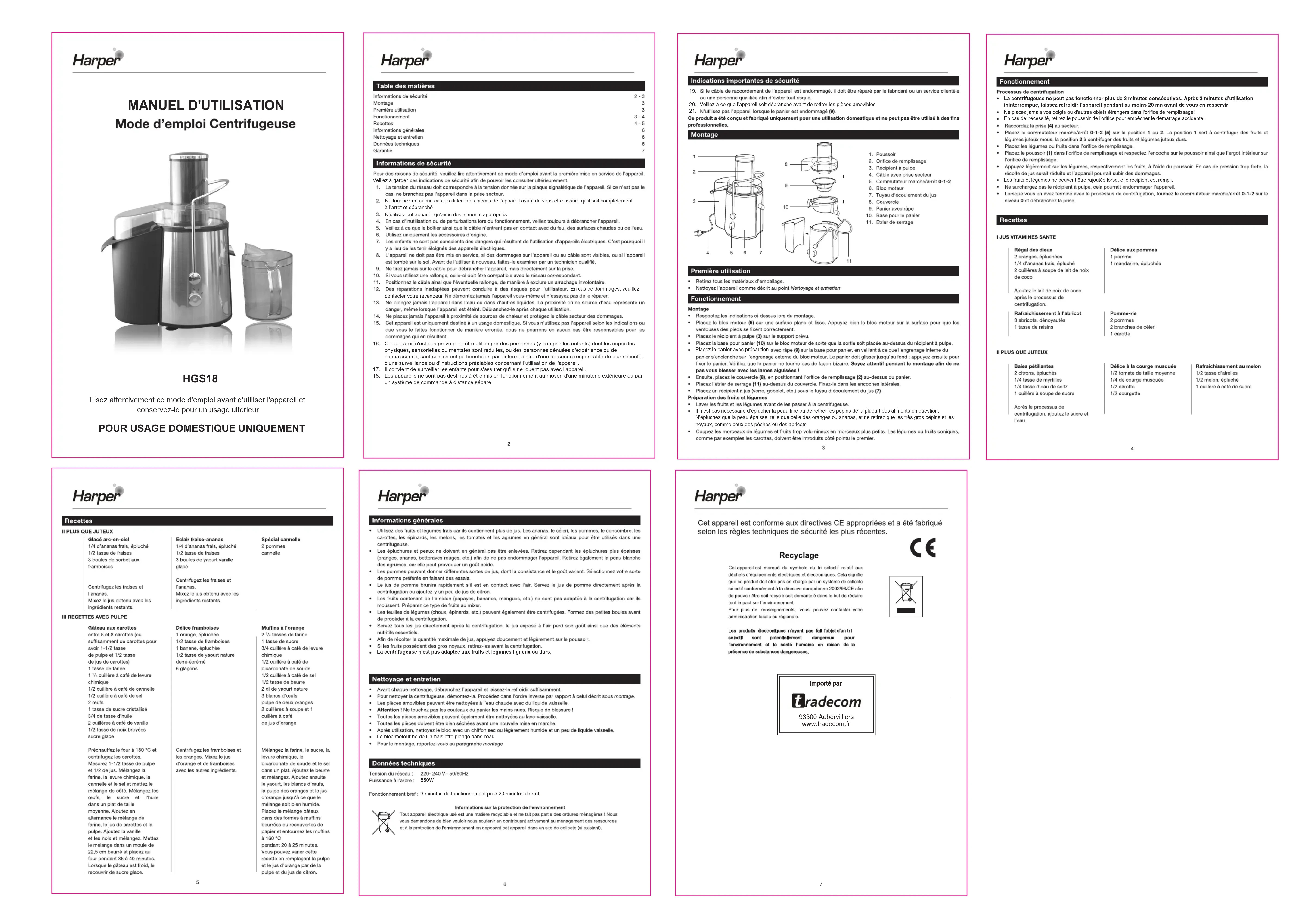 Veillez à garderPlacez le panier avec précautionIl n’est pas nécessaire d’éplucher la peau fine ou de retirer les pépins de la plupart des aliments en question. N’épluchez que la peau épaisse, telle que celle des oranges ou ananas, et ne retirez que les très gros pépins et les noyaux, comme ceux des pèches ou des abricotsVeillez à ce que l’appareil soit débranché avant de retirer les pièces amoviblesLe bloc moteur ne doit jamais être plongé dans l’eau3 minutes de fonctionnement pour 20 minutes d’arrêtLa centrifugeuse ne peut pas fonctionner plus de 3 minutes consécutives. Après 3 minutes d’utilisation ininterrompue, laissez refroidir l’appareil pendant au moins 20 mn avant de vous en resservirN’utilisez cet appareil qu’avec des aliments appropriésEn cas de dommages, veuillez contacter votre revendeurNe touchez en aucun cas les différentes pièces de l’appareil avant de vous être assuré qu’il soit complètement à l’arrêt et débranché 850W 16. Cet appareil n'est pas prévu pour être utilisé par des personnes (y compris les enfants) dont les capacités physiques, sensorielles ou mentales sont réduites, ou des personnes dénuées d'expérience ou de connaissance, sauf si elles ont pu bénéficier, par l'intermédiaire d'une personne responsable de leur sécurité, d'une surveillance ou d'instructions préalables concernant l'utilisation de l'appareil.17. Il convient de surveiller les enfants pour s'assurer qu'ils ne jouent pas avec l'appareil.18. Les appareils ne sont pas destinés à être mis en fonctionnement au moyen d'une minuterie extérieure ou par un système de commande à distance séparé.19. 20. 21. Ne placez jamais vos doigts ou d'autres objets étrangers dans l'orifice de remplissage! En cas de nécessité, retirez le poussoir de l'orifice pour empêcher le démarrage accidentel. Les fruits et légumes ne peuvent être rajoutés lorsque le récipient est rempli. La centrifugeuse n'est pas adaptée aux fruits et légumes ligneux ou durs. MANUEL D'UTILISATION HGS18 Lisez attentivement ce mode d'emploi avant d'utiliser l'appareil et conservez-le pour un usage ultérieur