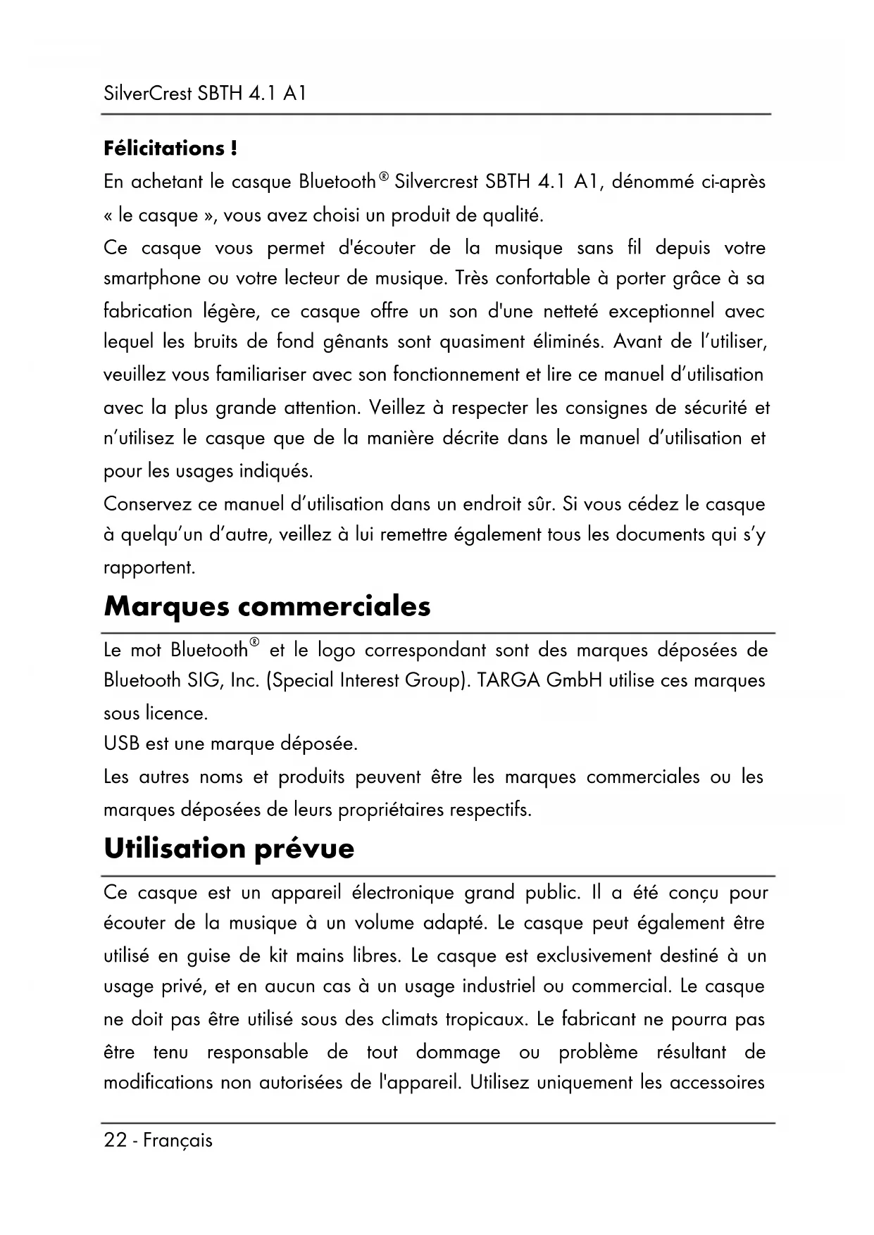 Silvercrest SBTH 4.1 A1, dénommé ci-après « le casque », vous avez choisi un produit de qualité. Ce casque vous permet d'écouter de la musique sans fil depuis votre smartphone ou votre lecteur de musique. Très confortable à porter grâce à sa fabrication légère, ce casque offre un son d'une netteté exceptionnel avec lequel les bruits de fond gênants sont quasiment éliminés. Avant de l’utiliser, veuillez vous familiariser avec son fonctionnement et lire ce manuel d’utilisation avec la plus grande attention. Veillez à respecter les consignes de sécurité et n’utilisez le casque que de la manière décrite dans le manuel d’utilisation et pour les usages indiqués. Conservez ce manuel d’utilisation dans un endroit sûr. Si vous cédez le casque à quelqu’un d’autre, veillez à lui remettre également tous les documents qui s’y rapportent. Marques commerciales Le mot Bluetooth