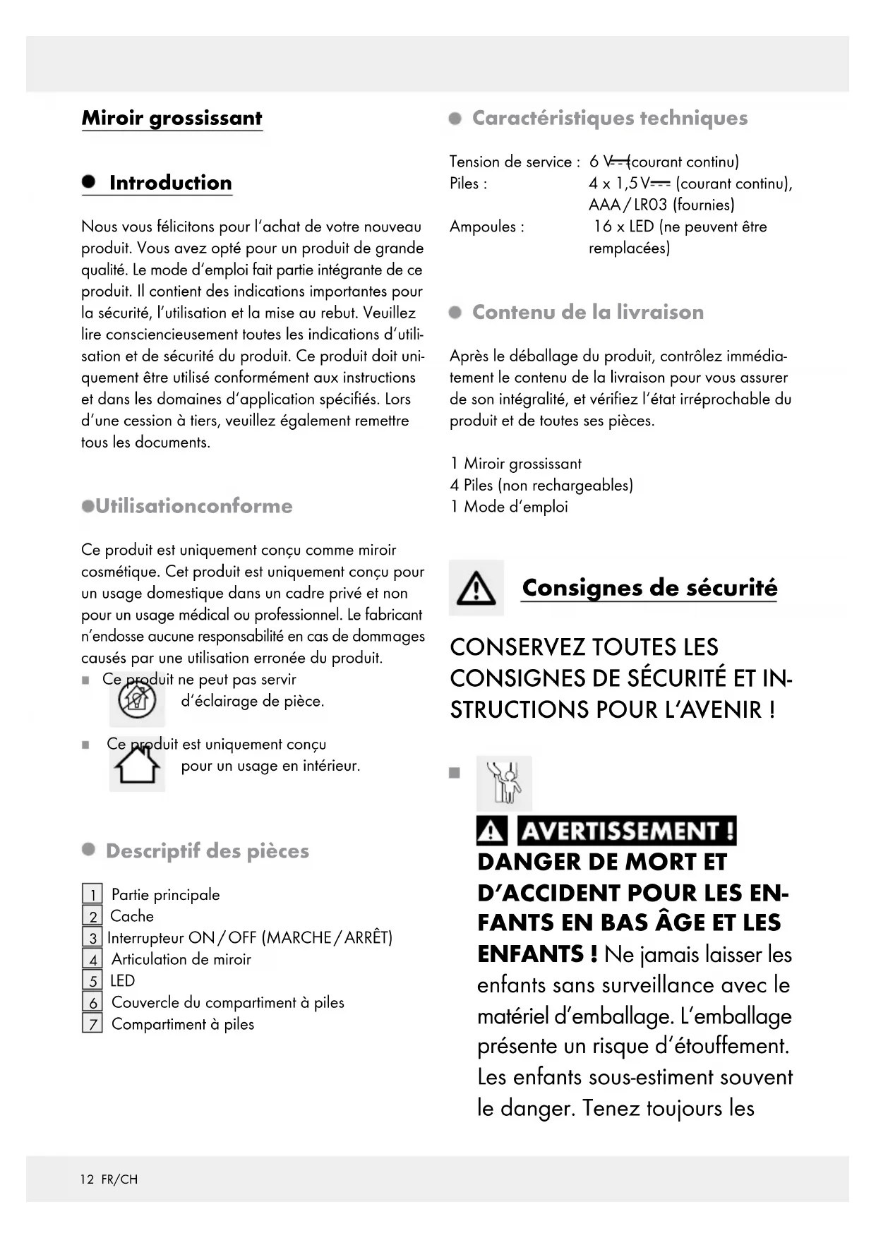 verfällt, wenn das Produkt beschädigt, nicht sach- gemäß benutzt oder gewartet wurde. Die Garantieleistung gilt für Material- oder Fabrika- tionsfehler. Diese Garantie erstreckt sich nicht auf Produktteile, die normaler Abnutzung ausgesetzt sind (z. B. Batterien) und daher als Verschleißteile ange- sehen werden können oder für Beschädigungen an zerbrechlichen Teilen, z. B. Schalter, Akkus oder die aus Glas gefertigt sind.11 FR/CH Introduction ................................................................................................................................... Page 12 Utilisation conforme ............................................................................................................................Page 12 Descriptif des pièces ...........................................................................................................................Page 12 Caractéristiques techniques ................................................................................................................Page 12 Contenu de la livraison .......................................................................................................................Page 12 Consignes de sécurité ...........................................................................................................Page 12 Consignes de sécurité relatives aux piles / aux piles rechargeables ...............................................Page 13 Mise en service du produit ...............................................................................................Page 15 Mise en place / remplacement des piles ........................................................................................... Page 15 Utilisation ........................................................................................................................................Page 15 Nettoyage et entretien ........................................................................................................ Page 15 Mise au rebut ............................................................................................................................... Page 15 Garantie ........................................................................................................................................... Page 1612 FR/CH Miroir grossissant Introduction Nous vous félicitons pour l‘achat de votre nouveau produit. Vous avez opté pour un produit de grande qualité. Le mode d‘emploi fait partie intégrante de ce produit. Il contient des indications importantes pour la sécurité, l’utilisation et la mise au rebut. Veuillez lire consciencieusement toutes les indications d‘utili- sation et de sécurité du produit. Ce produit doit uni- quement être utilisé conformément aux instructions et dans les domaines d‘application spécifiés. Lors d‘une cession à tiers, veuillez également remettre tous les documents. Utilisation conforme Ce produit est uniquement conçu comme miroir cosmétique. Cet produit est uniquement conçu pour un usage domestique dans un cadre privé et non pour un usage médical ou professionnel. Le fabricant n’endosse aucune responsabilité en cas de domm ages causés par une utilisation erronée du produit. Ce produit ne peut pas servir d‘éclairage de pièce. Ce produit est uniquement conçu pour un usage en intérieur. Descriptif des pièces