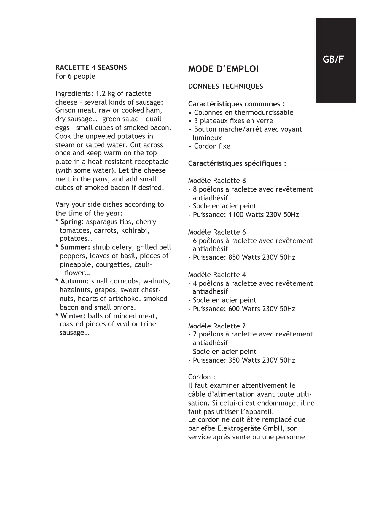 - Conseil : pour les taches récalcit- rantes et un dégraissage plus efcace,vouspouvezutiliserdu nettoyant pour vitre. Poêlons: nettoyez-les avec une éponge non abrasive, de l’eau chaude et du liquide vaisselle. Rincez. Ne frottez pas les poêlons avec des objets métalliques ou des produits abrasifs (risque de détério- ration du revêtement antiadhésif). Remarque: vous pouvez faire trem- per les poêlons ou les mettre au lave-vaisselle. Colonnes et socles en métal (selon modèles): nettoyez uniquement avec une éponge douce humide non abrasive. Séchez avec un chiffon sec. Attention de ne pas faire couler de l’eau sur les parties élec- triques. Ne trempez jamais votre appareil dans l’eau. RECETTES Conseils: choisissez un bon fromage à raclette. Comptez environ 200 g de fromage par personne. LA RACLETTE Pour 6 personnes Ingrédients: 1,2 Kg de fromage à raclette coupé en tranches; 12 pommes de terre; charcuterie au (jambon cuit, jambon cru, jambon fumé, viande séchée, viande des grisonscoupéeenneslamelles, saucisson…) accompagnements divers (petits oignons blancs vinaigre ; cornichons). Garnissez les poêlons d’une ou plusieurs tranches fromage à raclette. Laissez fondre jusqu‘à ce qu’une croûte dorée se forme à la surface. Accompagnez charcuterie, pomme de terre en robe des champs, verte, petits oignons blancs, cor- nichons, champignons, touche de poivre blanc moulu sur le fromage, des lamelles tomates, d’aubergines etc.…Servez un vin blanc sec FF/NL Savoie (Apremont, Abymes, Chignin ou Roussette). LE BERTHOUD Pour 6 personnes Ingrédients: 1,2 Kg de fromage d’Abondance coupé en tranches d’environ ½ centimètre; 12 pommes de terre; charcuterie au choix (jambon cuit, jambon cru, jambon fumé, viande séchée, viande des grisonscoupéeenneslamelles, saucisson…); accompagnements divers (petits oignons blancs au vinaigre; cornichons). Garnissez les poêlons d’une ou plusieurs tranches de fromage d’Abondance. Laissez fondre jusqu‘à ce qu’une légère croûte dorée se forme à la surface. Accompagnez de charcuterie, pomme de terre en robe des champs, salade verte, d’un vin blanc sec de Savoie… GEBRUIKSAANWIJZING TECHNISCHE GEGEVENS Gemeenschappelijke eigenschappen voor alle modellen: