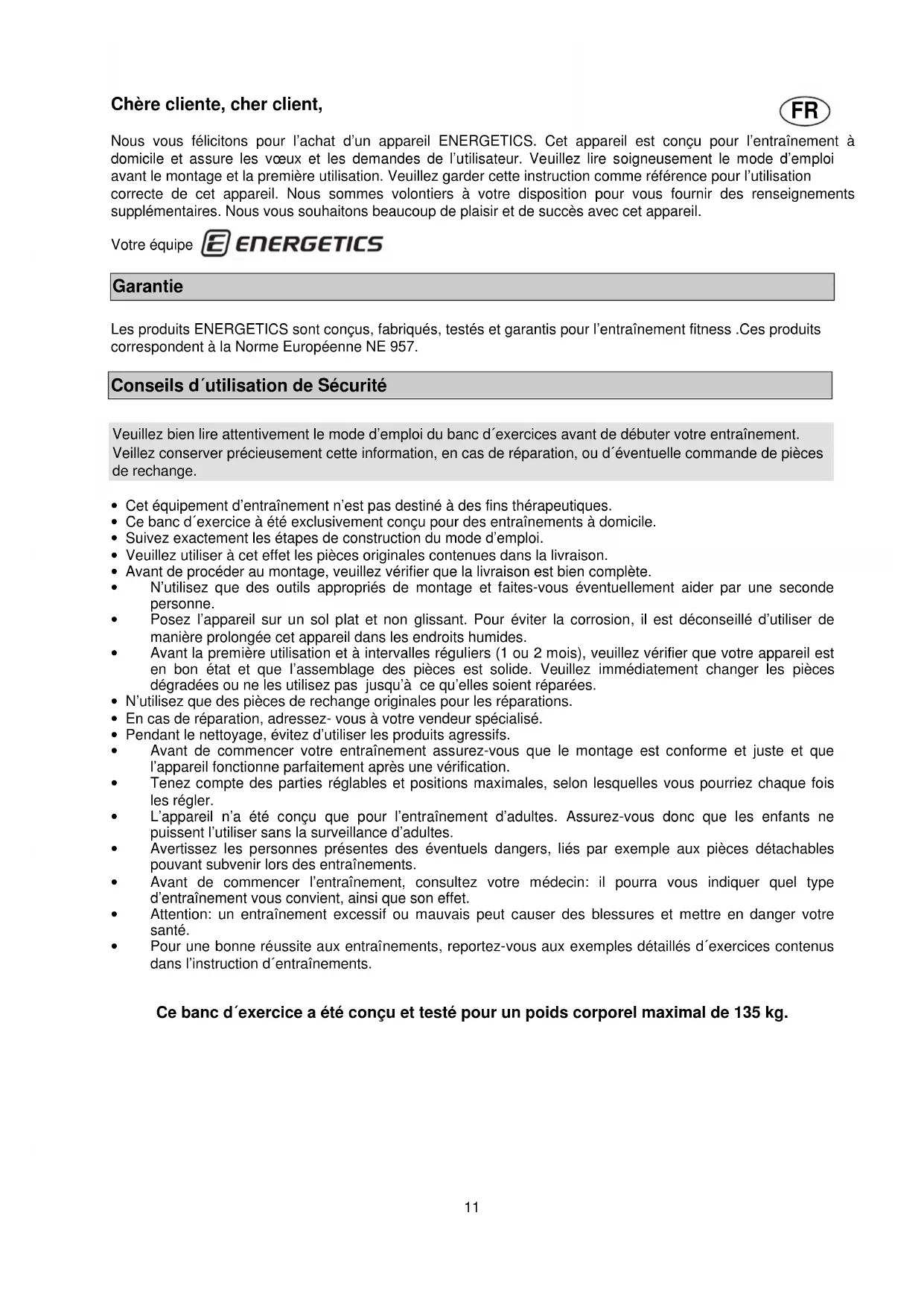 Chère cliente, cher client, Nous vous félicitons pour l’achat d’un appareil ENERGETICS. Cet appareil est conçu pour l’entraînement à domicile et assure les vœux et les demandes de l’utilisateur. Veuillez lire soigneusement le mode d’emploi avant le montage et la première utilisation. Veuillez garder cette instruction comme référence pour l’utilisation correcte de cet appareil. Nous sommes volontiers à votre disposition pour vous fournir des renseignements supplémentaires. Nous vous souhaitons beaucoup de plaisir et de succès avec cet appareil. Votre équipe Garantie Les produits ENERGETICS sont conçus, fabriqués, testés et garantis pour l’entraînement fitness .Ces produits correspondent à la Norme Européenne NE 957. Conseils d´utilisation de Sécurité
