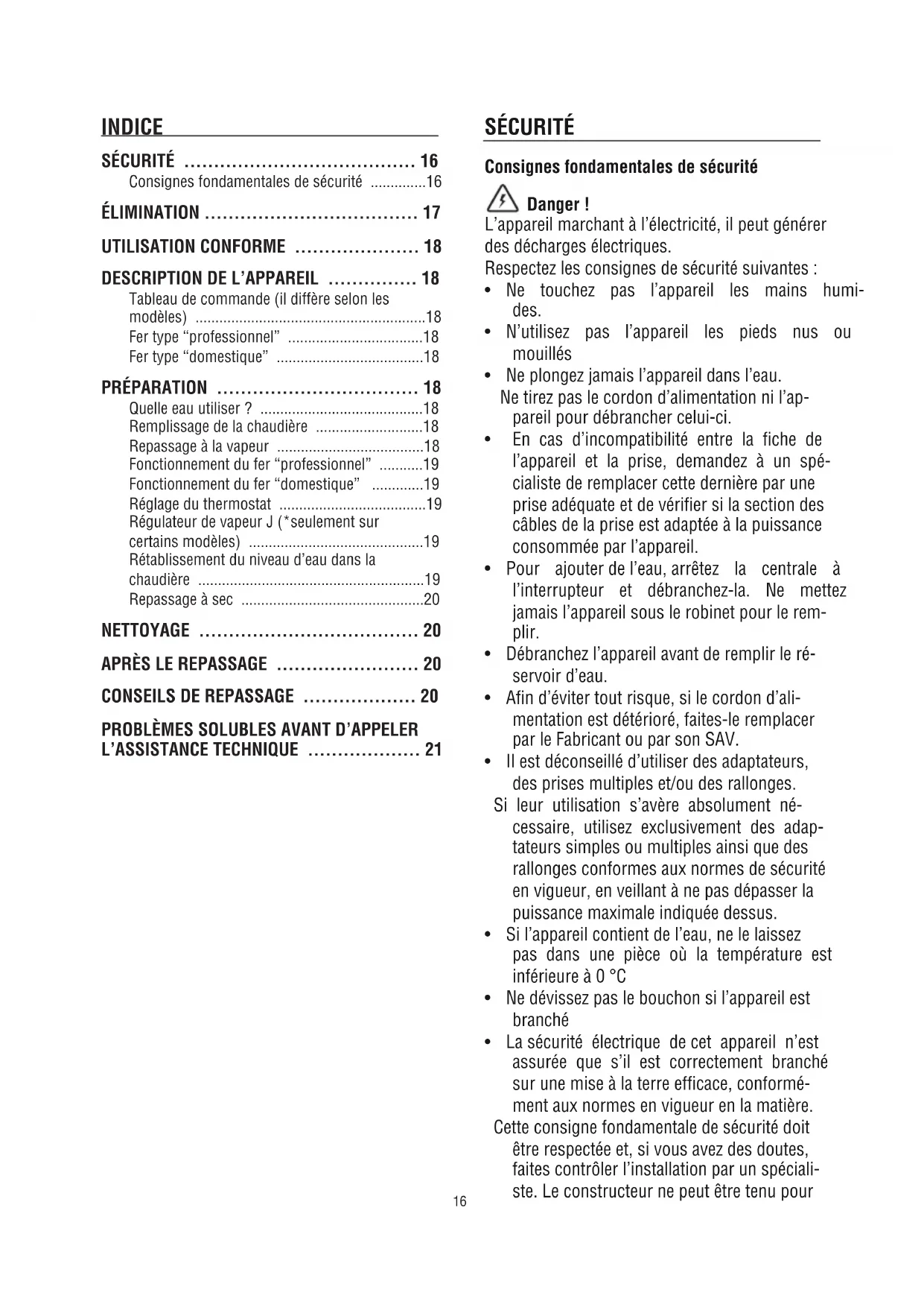 - La sécurité électrique de cet appareil n’est assurée que s’il est correctement branché sur une mise à la terre efficace, conformé- ment aux normes en vigueur en la matière. Cette consigne fondamentale de sécurité doit êtrerespectéeet,sivousavezdesdoutes, faites contrôler l’installation par un spéciali- ste.Leconstructeurnepeutêtretenupour INDICE SÉCURITÉ ....................................... 16 Consignes fondamentales de sécurité ..............16 ÉLIMINATION .................................... 17 UTILISATION CONFORME ..................... 18