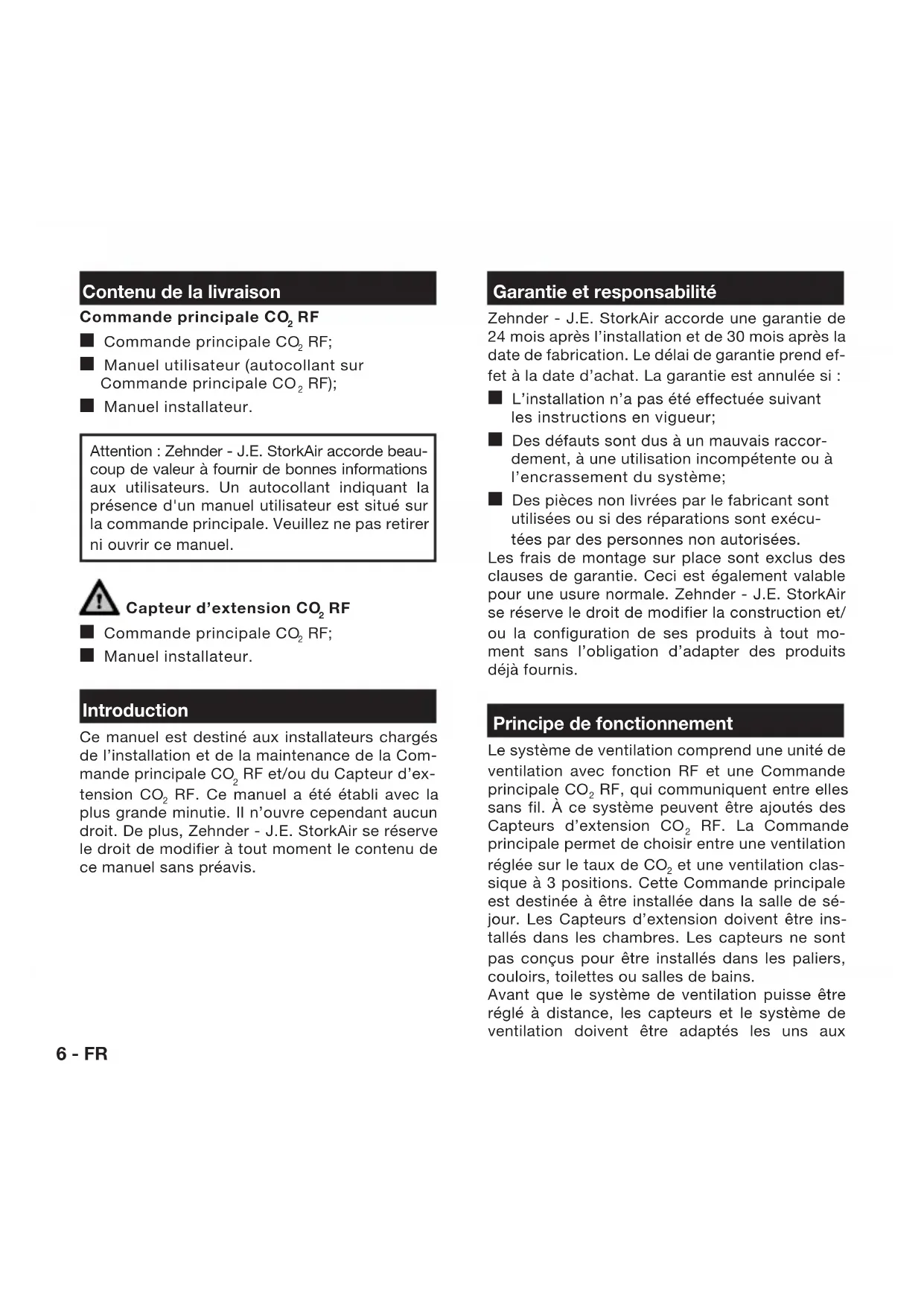 RF); ■ Manuel installateur. Attention : Zehnder - J.E. StorkAir accorde beau- coup de valeur à fournir de bonnes informations aux utilisateurs. Un autocollant indiquant la présence d'un manuel utilisateur est situé sur la commande principale. Veuillez ne pas retirer ni ouvrir ce manuel. Capteur d’extension CO