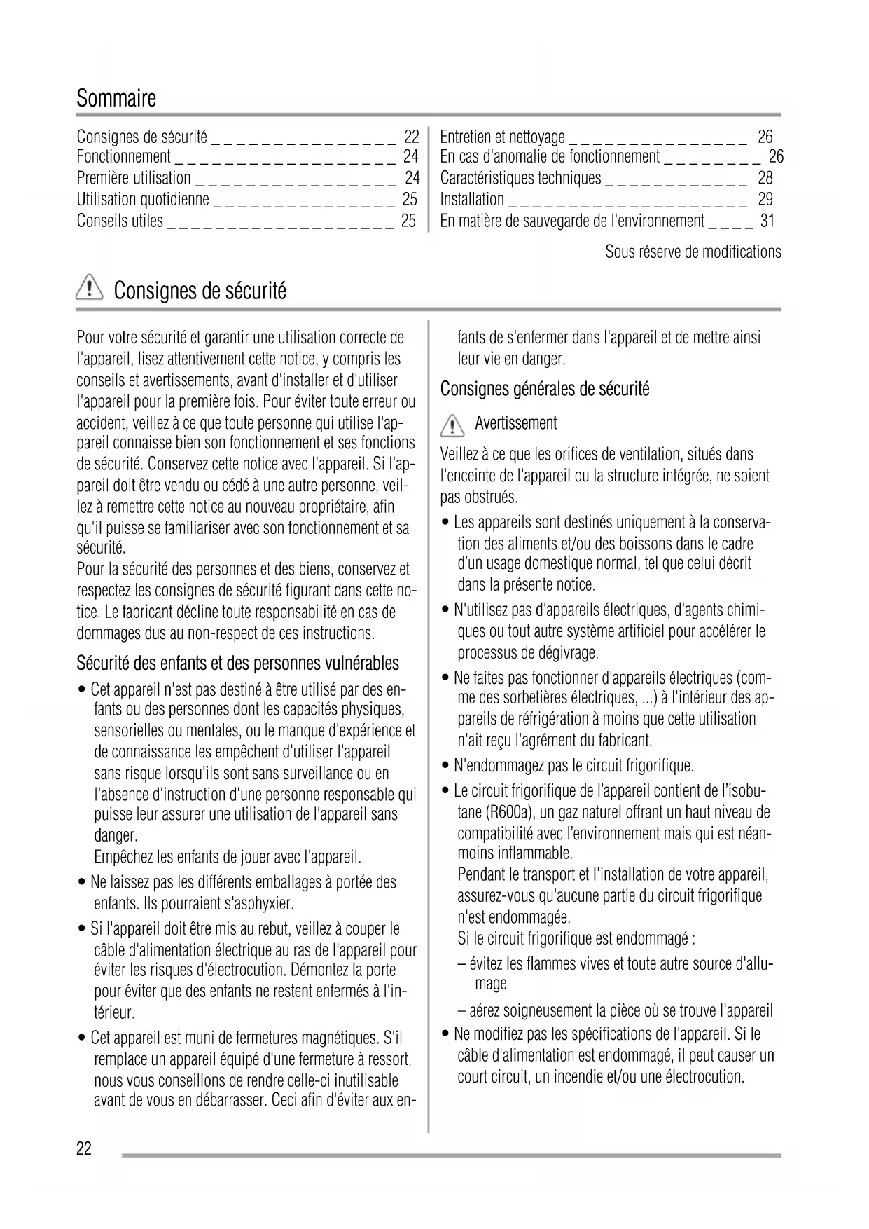 - La porte ouvre et ferme correctement. Si la température ambiante est basse (en hiver, par exem- ple), il se peut que le joint n'adhère pas parfaitement. Dans ce cas, attendez que le joint reprenne sa taille natu- relle. Si vous ne voulez pas effectuer personnellement les opé- rations décrites ci-dessus, contactez le S.A.V. le plus pro- che. Un technicien du S.A.V. pourra inverser le sens d'ou- verture de la porte, mais cette intervention vous sera fac- turée. Branchement électrique Contrôlez, avant de brancher l'appareil, si la tension et la fréquence indiquées sur la plaque signalétique correspon- dent à celles de votre réseau. L'appareil doit être relié à la terre. La fiche du câble d'ali- mentation comporte un logement pour mise à la terre. Si la prise de courant murale n'est pas mise à la terre, bran- chez l'appareil sur une prise de terre conformément aux normes en vigueur, en demandant conseil à un électricien qualifié. Le fabricant décline toute responsabilité en cas d'incident suite au non-respect des consignes de sécurité sus-men- tionnées. Cet appareil est conforme aux directives communautaires. 30En matière de sauvegarde de l'environnement Le symbole sur le produit ou son emballage indique que ce produit ne peut être traité comme déchet ménager. Il doit être remis au point de collecte dédié à cet effet (collecte et recyclage du matériel électrique et électronique). En procédant à la mise au rebut de l'appareil dans les règles de l’art, nous préservons l'environnement et notre sécurité, s’assurant ainsi que les déchets seront traités dans des conditions optimum. Pour obtenir plus de détails sur le recyclage de ce produit, veuillez prendre contact avec les services de votre commune ou le magasin où vous avez effectué l'achat. 31Inhalt Sicherheitshinweise _ _ _ _ _ _ _ _ _ _ _ _ _ _ _ _ 32 Betrieb _ _ _ _ _ _ _ _ _ _ _ _ _ _ _ _ _ _ _ _ _ _ 34 Erste Inbetriebnahme _ _ _ _ _ _ _ _ _ _ _ _ _ _ _ _ 34 Täglicher Gebrauch _ _ _ _ _ _ _ _ _ _ _ _ _ _ _ _ 34 Praktische Tipps und Hinweise _ _ _ _ _ _ _ _ _ _ _ 35 Reinigung und Pflege _ _ _ _ _ _ _ _ _ _ _ _ _ _ _ 36 Was tun, wenn … _ _ _ _ _ _ _ _ _ _ _ _ _ _ _ _ _ 36 Technische Daten _ _ _ _ _ _ _ _ _ _ _ _ _ _ _ _ _ 38 Montage _ _ _ _ _ _ _ _ _ _ _ _ _ _ _ _ _ _ _ _ _ _ 39 Hinweise zum Umweltschutz _ _ _ _ _ _ _ _ _ _ _ _ 41 Änderungen vorbehalten Sicherheitshinweise Lesen Sie zu Ihrer Sicherheit und für die optimale Geräte- anwendung vor der Installation und dem Gebrauch des Gerätes die vorliegende Benutzerinformation aufmerksam durch, einschließlich der Ratschläge und Warnungen. Es ist wichtig, dass zur Vermeidung von Fehlern und Unfäl- len alle Personen, die das Gerät benutzen, mit der Bedie- nung und den Sicherheitsvorschriften vertraut sind. Heben Sie die Benutzerinformation gut auf und übergeben Sie sie bei einem Weiterverkauf des Gerätes dem neuen Besitzer, so dass jeder während der gesamten Lebensdauer des Ge- rätes über Gebrauch und Sicherheit informiert ist. Halten Sie sich zu Ihrer Sicherheit und zum Schutz Ihres Eigentums strikt an die Vorsichtsmaßnahmen der vorlie- genden Benutzerinformation, da der Hersteller bei Miss- achtung derselben von jeder Haftung freigestellt ist. Sicherheit von Kindern und hilfsbedürftigen Personen