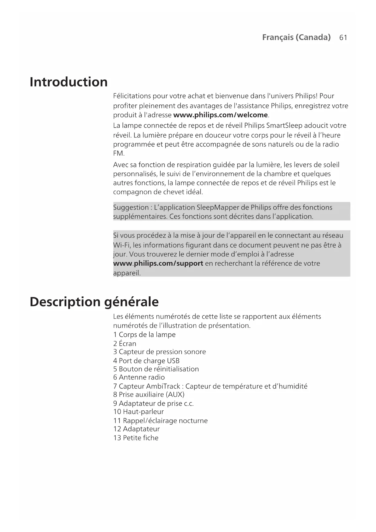 Introduction Félicitations pour votre achat et bienvenue dans l'univers Philips! Pour profiter pleinement des avantages de l'assistance Philips, enregistrez votre produit à l'adresse www.philips.com/welcome. La lampe connectée de repos et de réveil Philips SmartSleep adoucit votre réveil. La lumière prépare en douceur votre corps pour le réveil à l’heure programmée et peut être accompagnée de sons naturels ou de la radio FM. Avec sa fonction de respiration guidée par la lumière, les levers de soleil personnalisés, le suivi de l’environnement de la chambre et quelques autres fonctions, la lampe connectée de repos et de réveil Philips est le compagnon de chevet idéal. Suggestion: L’application SleepMapper de Philips offre des fonctions supplémentaires. Ces fonctions sont décrites dans l’application. Si vous procédez à la mise à jour de l’appareil en le connectant au réseau Wi-Fi, les informations figurant dans ce document peuvent ne pas être à jour. Vous trouverez le dernier mode d’emploi à l’adresse www.philips.com/support en recherchant la référence de votre appareil. Description générale Les éléments numérotés de cette liste se rapportent aux éléments numérotés de l’illustration de présentation. 1 Corps de la lampe 2 Écran 3 Capteur de pression sonore 4 Port de charge USB 5 Bouton de réinitialisation 6 Antenne radio 7 Capteur AmbiTrack: Capteur de température et d’humidité 8 Prise auxiliaire (AUX) 9 Adaptateur de prise c.c. 10 Haut-parleur 11 Rappel/éclairage nocturne 12 Adaptateur 13 Petite fiche62 Français (Canada) Utilisation prévue La lampe de repos et de réveil connectée Philips SmartSleepa été conçue pour assurer un réveil plus naturel et agréable et une sensation de relaxation avant de vous endormir. Il ne s’agit pas d’un produit d’éclairage général. Les effets de la lampe de repos et de réveil La lampe de repos et de réveil connectée Philips SmartSleep prépare tout en douceur votre corps au réveil pendant les 30dernières minutes de sommeil. Au réveil, les yeux sont plus sensibles à la lumière que lorsque nous sommes éveillés. Durant cette période, la lumière légère d’un lever de soleil simulé prépare notre corps au réveil et nous aide à être frais et dispos. Les personnes qui utilisent cet appareil se lèvent plus facilement, sont de meilleure humeur le matin et ont plus de tonus. La sensibilité à la lumière diffère d’une personne à l’autre. Vous pouvez donc régler l’intensité lumineuse de la lampe à un niveau qui vous convient pour commencer la journée du bon pied. Pour ressentir pleinement les effets de la lumière de repos et de réveil connectée, placez-le à environ 40 – 50cm de votre tête, sur une surface plane et stable de votre table de chevet. Pour plus d’informations sur la lampe connectée de repos et de réveil, rendez-vous sur le site www.philips.com. Icônes du menu interactif Profil de réveil/Alarme Intensité lumineuse et lumière allumée/éteinte Revenir au niveau supérieur du menu Réglages Sons Confirmer et enregistrer les paramètres Programme de détente Prise AUX Radio Activer la connexion Wi-Fi Désactiver la connexion Wi-Fi Modifier les paramètres d’alarme Paramètres d’affichage et luminosité de l’afficheur Sélectionner un son naturel Ignorer l’alarme Activer le délai d’affichage Désactiver le délai d’affichage Désactiver l’alarme63 Français (Canada) Activer le retour audio Désactiver le retour audio Guidage lumineux ou sonore Simulation du crépuscule Durée du profil de réveil Supprimer le profil de réveil Jours de la semaine RelaxBreathe Rythme RelaxBreathe Choisir le jour de la semaine Supprimer le choix du jour de la semaine Durée d’un programme Activer l’heure du coucher Commencer le programme Arrêter le programme Connexion de votre appareil à la Wi-Fi Si vous procédez à la mise à jour de l’appareil en le connectant au réseau Wi-Fi, les informations figurant dans ce document peuvent ne pas être à jour. Consultez le plus récent manuel d’utilisation à l’adresse www.philips.com/support. Philips se réserve le droit de mettre à jour le microgiciel de l’appareil. Configuration Wi-Fi facile Téléchargez l’application SleepMapper de Philips sur votre téléphone cellulaire depuis GooglePlay ou l’AppStore. Consultez les informations dans GooglePlay ou l’AppStore pour vérifier si votre téléphone cellulaire est compatible avec l’application. Vous pouvez facilement configurer la connexion Wi-Fi à votre lampe de repos et de réveil. L’installation de la lampe de repos et de réveil et la connexion au réseau Wi-Fi résidentiel ne sont à configurer qu’une seule fois. La configuration prend 5 à 10minutes. Assistant de configuration de la lampe connectée de repos et de réveil 1 Lorsque vous utilisez la lampe connectée de repos et de réveil pour la première fois, l’assistant de configuration de l’appareil démarre. 2 Après avoir sélectionné votre langue sur l’afficheur de l’appareil, continuez la configuration dans l’application. Assurez-vous que l’application est ouverte sur votre téléphone cellulaire. 3 Suivez les directives fournies dans l’application pour connecter votre appareil au réseau Wi-Fi. Si vous avez des difficultés pour connecter votre appareil, consultez la section d’assistance de l’application ou la section Dépannage de ce mode d’emploi (voir «Résolution des problèmes»).64 Français (Canada)
