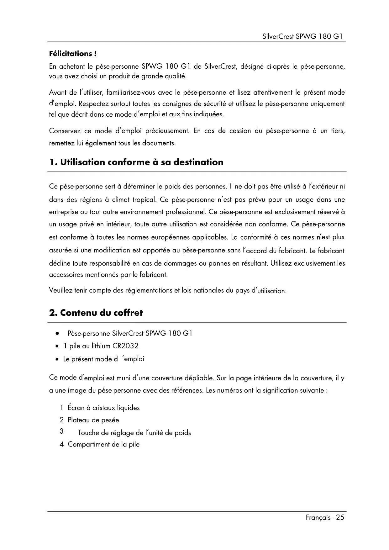 Français - 25 Félicitations ! En achetant le pèse-personne SPWG 180 G1 de SilverCrest, désigné ci-après le pèse-personne, vous avez choisi un produit de grande qualité. Avant de l ’utiliser, familiarisez-vous avec le pèse-personne et lisez attentivement le présent mode