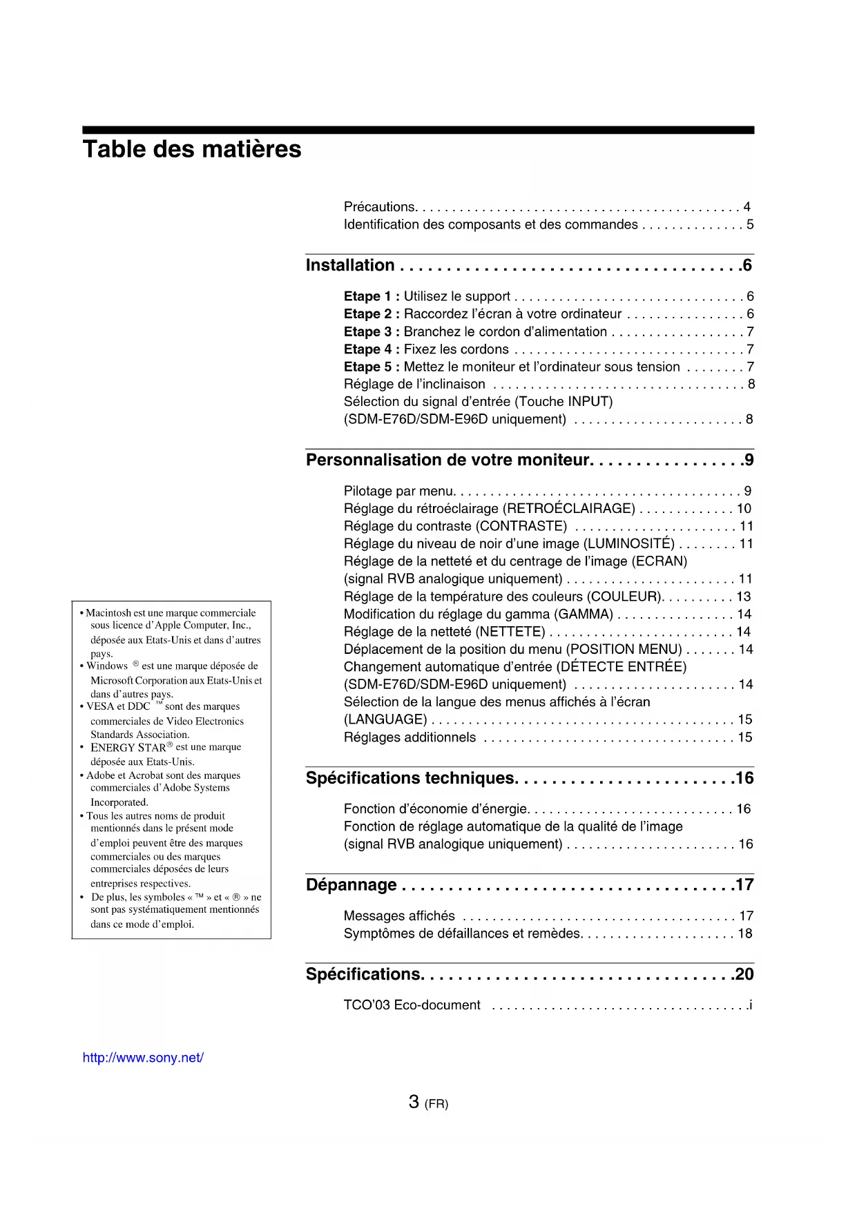 - De plus, les symboles « ™ » et « ® » ne sont pas systématiquement mentionnés dans ce mode d’emploi. http://www.sony.net/ 3 (FR) Précautions. . . . . . . . . . . . . . . . . . . . . . . . . . . . . . . . . . . . . . . . . . . . 4 Identification des composants et des commandes . . . . . . . . . . . . . . 5 Installation . . . . . . . . . . . . . . . . . . . . . . . . . . . . . . . . . . . . .6 Etape 1 : Utilisez le support . . . . . . . . . . . . . . . . . . . . . . . . . . . . . . . 6 Etape 2 : Raccordez l’écran à votre ordinateur . . . . . . . . . . . . . . . . 6 Etape 3 : Branchez le cordon d’alimentation . . . . . . . . . . . . . . . . . . 7 Etape 4 : Fixez les cordons . . . . . . . . . . . . . . . . . . . . . . . . . . . . . . . 7 Etape 5 : Mettez le moniteur et l’ordinateur sous tension . . . . . . . . 7 Réglage de l’inclinaison . . . . . . . . . . . . . . . . . . . . . . . . . . . . . . . . . . 8 Sélection du signal d’entrée (Touche INPUT) (SDM-E76D/SDM-E96D uniquement) . . . . . . . . . . . . . . . . . . . . . . . 8 Personnalisation de votre moniteur. . . . . . . . . . . . . . . . .9 Pilotage par menu. . . . . . . . . . . . . . . . . . . . . . . . . . . . . . . . . . . . . . . 9 Réglage du rétroéclairage (RETROÉCLAIRAGE) . . . . . . . . . . . . . 10 Réglage du contraste (CONTRASTE) . . . . . . . . . . . . . . . . . . . . . . 11 Réglage du niveau de noir d’une image (LUMINOSITÉ) . . . . . . . . 11 Réglage de la netteté et du centrage de l’image (ECRAN) (signal RVB analogique uniquement) . . . . . . . . . . . . . . . . . . . . . . . 11 Réglage de la température des couleurs (COULEUR). . . . . . . . . . 13 Modification du réglage du gamma (GAMMA) . . . . . . . . . . . . . . . . 14 Réglage de la netteté (NETTETE) . . . . . . . . . . . . . . . . . . . . . . . . . 14 Déplacement de la position du menu (POSITION MENU) . . . . . . . 14 Changement automatique d’entrée (DÉTECTE ENTRÉE) (SDM-E76D/SDM-E96D uniquement) . . . . . . . . . . . . . . . . . . . . . . 14 Sélection de la langue des menus affichés à l’écran (LANGUAGE) . . . . . . . . . . . . . . . . . . . . . . . . . . . . . . . . . . . . . . . . . 15 Réglages additionnels . . . . . . . . . . . . . . . . . . . . . . . . . . . . . . . . . . 15 Spécifications techniques. . . . . . . . . . . . . . . . . . . . . . . .16 Fonction d’économie d’énergie. . . . . . . . . . . . . . . . . . . . . . . . . . . . 16 Fonction de réglage automatique de la qualité de l’image (signal RVB analogique uniquement) . . . . . . . . . . . . . . . . . . . . . . . 16 Dépannage . . . . . . . . . . . . . . . . . . . . . . . . . . . . . . . . . . . .17 Messages affichés . . . . . . . . . . . . . . . . . . . . . . . . . . . . . . . . . . . . . 17 Symptômes de défaillances et remèdes. . . . . . . . . . . . . . . . . . . . . 18 Spécifications. . . . . . . . . . . . . . . . . . . . . . . . . . . . . . . . . .20 TCO’03 Eco-document . . . . . . . . . . . . . . . . . . . . . . . . . . . . . . . . . . .i4 (FR) Précautions Avertissement sur les connexions d’alimentation
