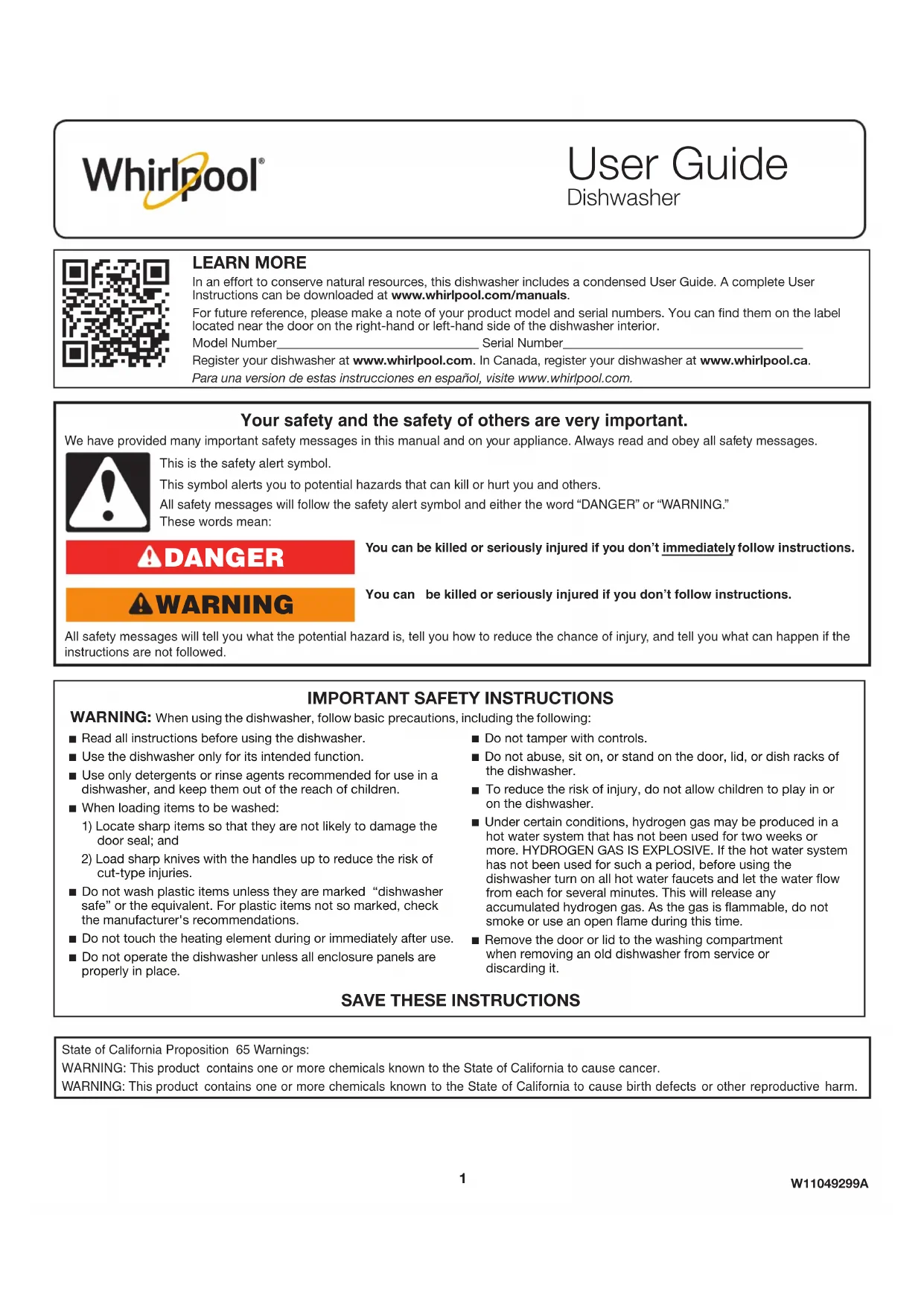 Afin de conserver les ressources naturelles, ce lave-vaisselle comprend un guide d’utilisation rapide. L’utilisateur trouvera un guide d’utilisation complet téléchargeable sur http://www.whirlpool.ca/manuals. Pour référence ultérieure, consignez par écrit les numéros de modèle et de série de votre produit. Ceux-ci se trouvent sur l’étiquette collée près de la porte, sur la paroi interne droite ou gauche. Numéro de modèle __________________________ Numéro de série du produit _________________________Enregistrer le lave-vaisselle sur www.whirlpool.ca.Risque possible de décès ou de blessure grave si vous ne suivez pas immédiatement les instructions.Risque possible de décès ou de blessure grave si vous ne suivez pas les instructions. Tous les messages de sécurité vous diront quel est le danger potentiel et vous disent comment réduire le risque de blessure et ce qui peut se produire en cas de non-respect des instructions. Votre sécurité et celle des autres est très importante. Nous donnons de nombreux messages de sécurité importants dans ce manuel et sur votre appareil ménager. Assurez-vous de toujours lire tous les messages de sécurité et de vous y conformer. AVERTISSEMENT DANGER