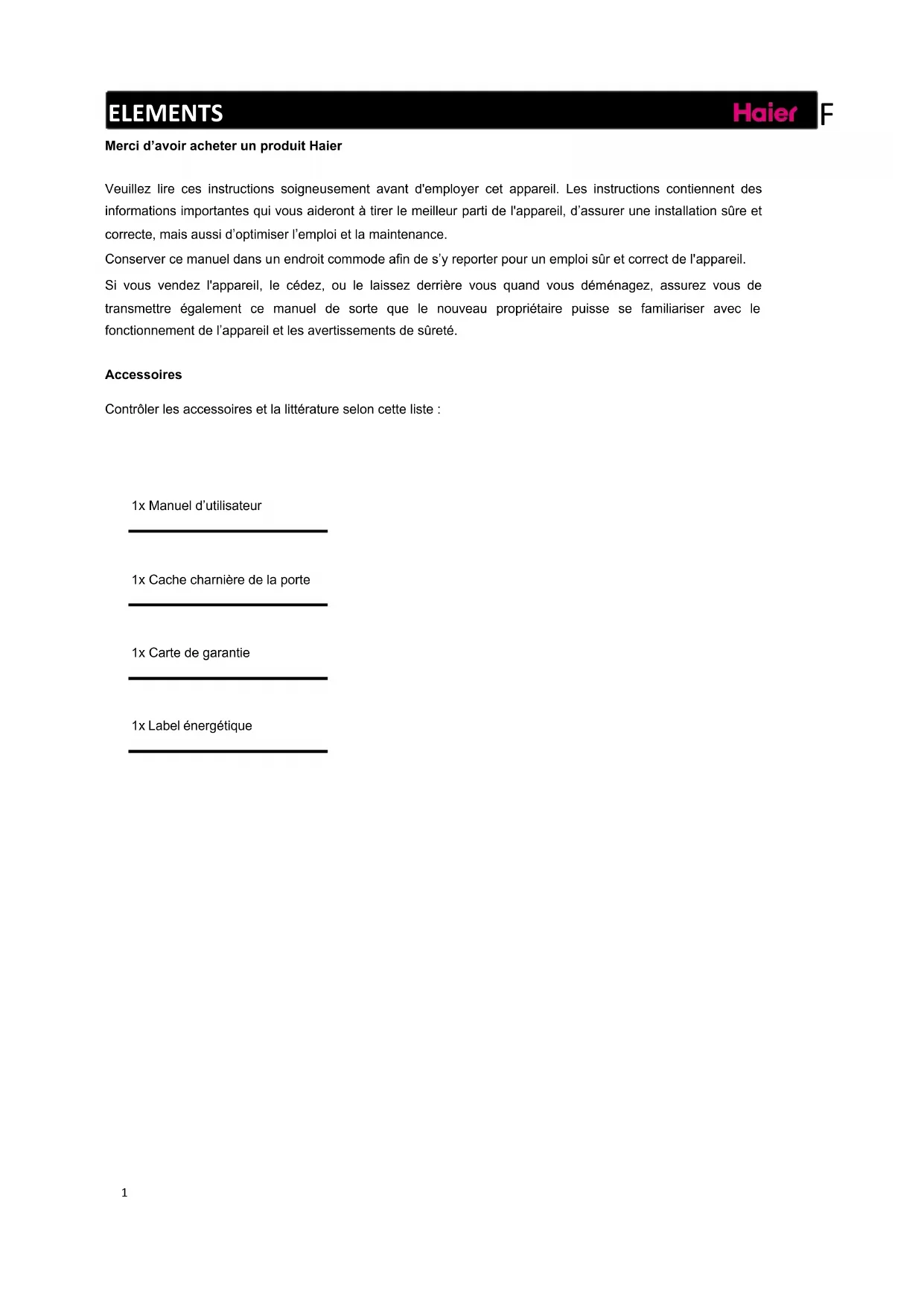 Merci d’avoir acheter un produit Haier Veuillez lire ces instructions soigneusement avant d'employer cet appareil. Les instructions contiennent des informations importantes qui vous aideront à tirer le meilleur parti de l'appareil, d’assurer une installation sûre et correcte, mais aussi d’optimiser l’emploi et la maintenance. Conserver ce manuel dans un endroit commode afin de s’y reporter pour un emploi sûr et correct de l'appareil. Si vous vendez l'appareil, le cédez, ou le laissez derrière vous quand vous déménagez, assurez vous de transmettre également ce manuel de sorte que le nouveau propriétaire puisse se familiariser avec le fonctionnement de l’appareil et les avertissements de sûreté. Accessoires Contrôler les accessoires et la littérature selon cette liste :
