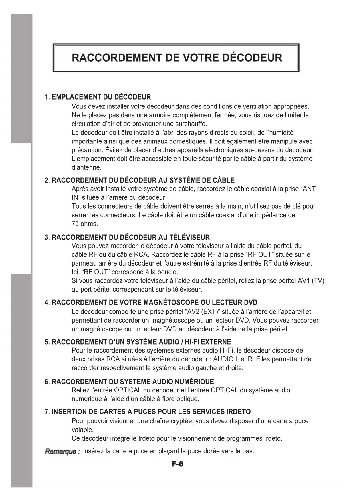 NETTOYAGE : Débranchez le décodeur de la prise murale avant de procéder au nettoyage. Utilisez un chiffon légèrement humide (n'utilisez pas de solvants) pour nettoyer l'extérieur de l'appareil.