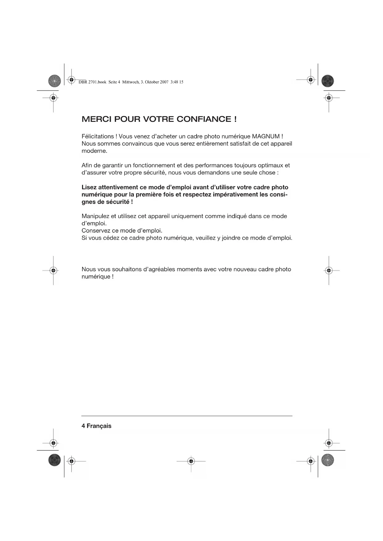 Félicitations! Vous venez d'acheter un cadre photo numérique MAGNUM! Nous sommes convaçus que vous serez entière satisfait de cet apparéil moderne.