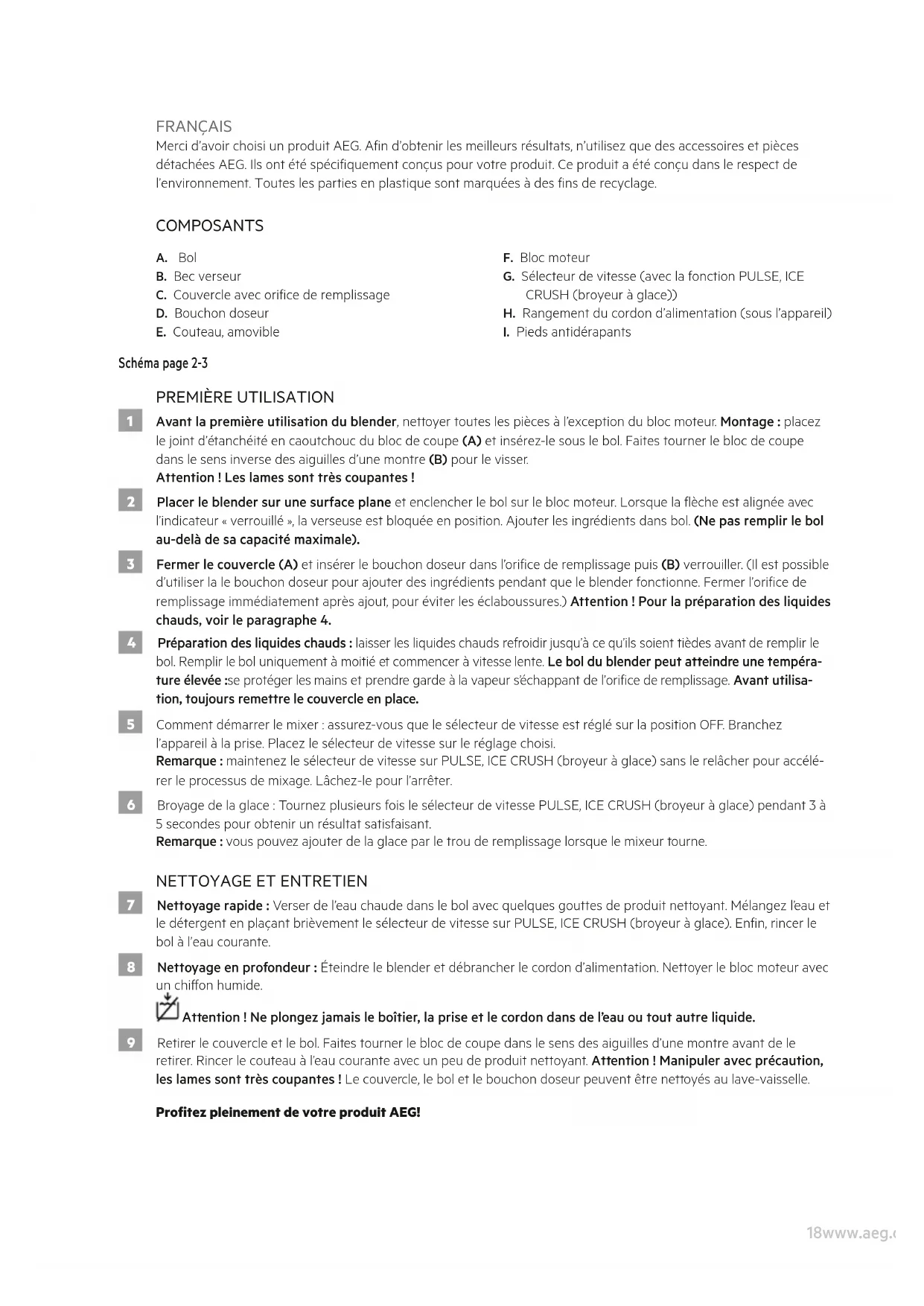 7 Nettoyage rapide : Verser de l’eau chaude dans le bol avec quelques gouttes de produit nettoyant. Mélangez l’eau et le détergent en plaçant brièvement le sélecteur de vitesse sur PULSE, ICE CRUSH (broyeur à glace). Enn, rincer le bol à l’eau courante. 8 Nettoyage en profondeur : Éteindre le blender et débrancher le cordon d’alimentation. Nettoyer le bloc moteur avec un chion humide. Attention ! Ne plongez jamais le boîtier, la prise et le cordon dans de l’eau ou tout autre liquide. 9 Retirer le couvercle et le bol. Faites tourner le bloc de coupe dans le sens des aiguilles d’une montre avant de le retirer. Rincer le couteau à l’eau courante avec un peu de produit nettoyant. Attention ! Manipuler avec précaution, les lames sont très coupantes ! Le couvercle, le bol et le bouchon doseur peuvent être nettoyés au lave-vaisselle. Protez pleinement de votre produit AEG!19www.aeg.com