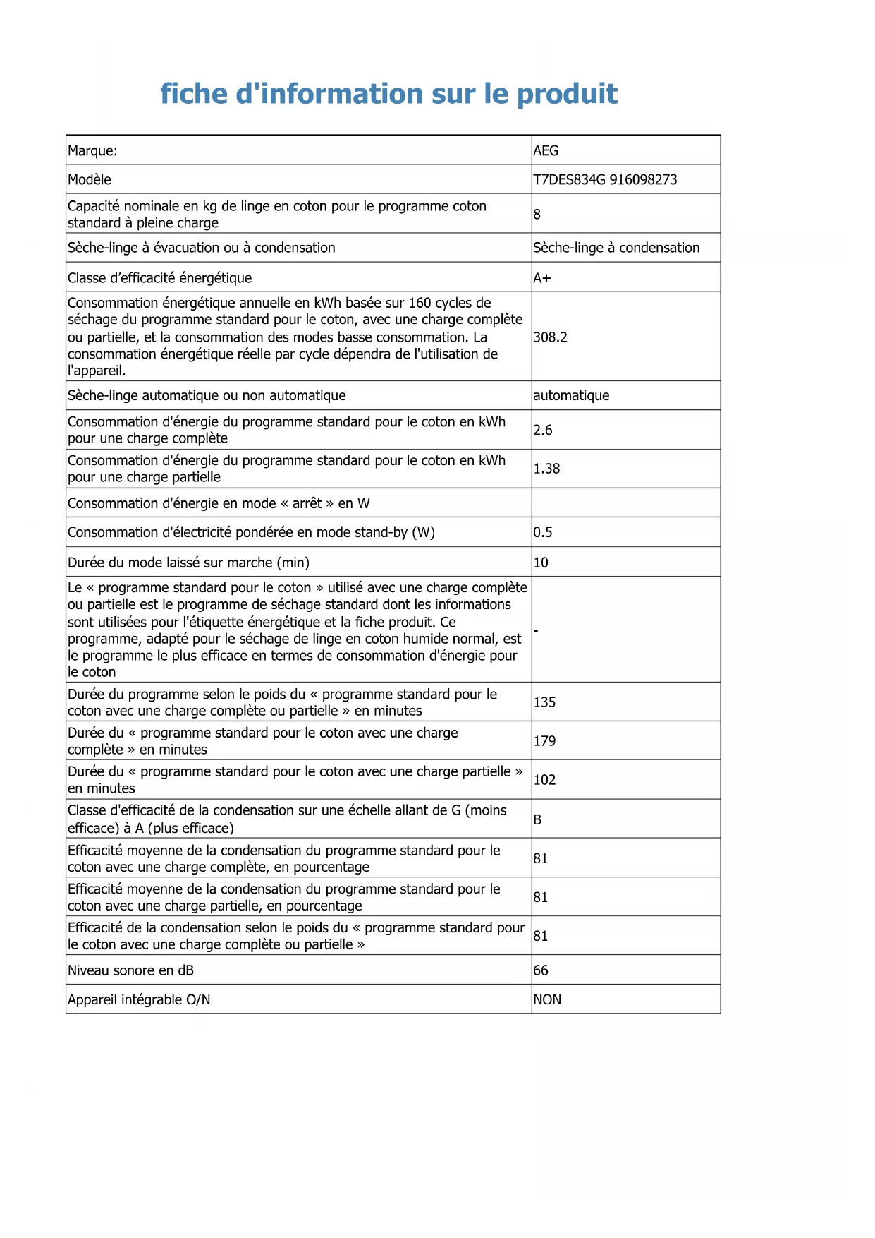 | Type de produit | Sèche-linge à condensation |
