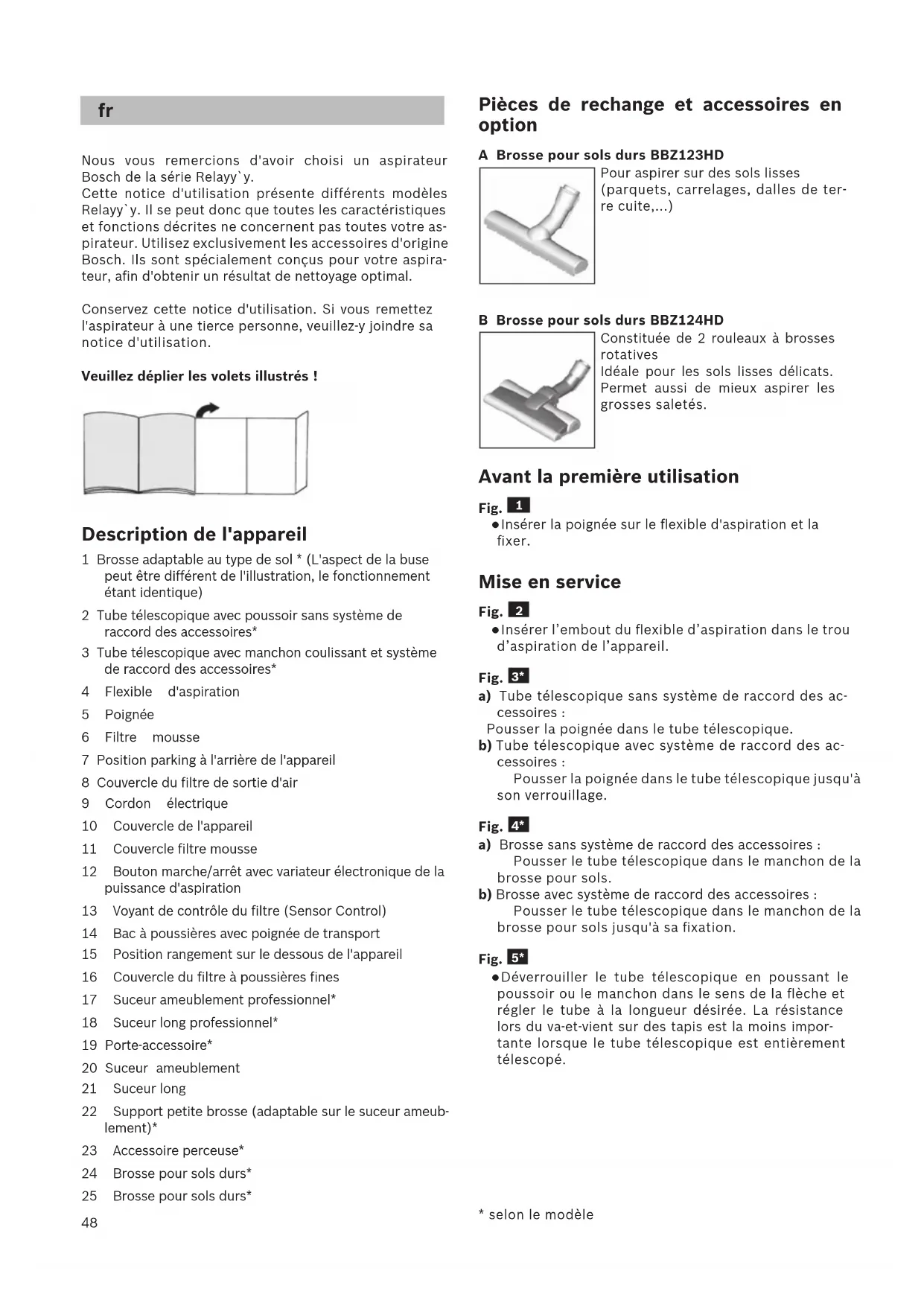 Caution: Do not use abrasive materials, glass-cleaning agents or all-purpose cleaning products. Never im- merse the vacuum cleaner in water. Subject to technical modifications.48 Nous vous remercions d'avoir choisi un aspirateur Bosch de la série Relayy`y. Cette notice d'utilisation présente différents modèles Relayy`y. Il se peut donc que toutes les caractéristiques et fonctions décrites ne concernent pas toutes votre as- pirateur. Utilisez exclusivement les accessoires d'origine Bosch. Ils sont spécialement conçus pour votre aspira- teur, afin d'obtenir un résultat de nettoyage optimal. Conservez cette notice d'utilisation. Si vous remettez l'aspirateur à une tierce personne, veuillez-y joindre sa notice d'utilisation. Veuillez déplier les volets illustrés ! Description de l'appareil 1 Brosse adaptable au type de sol * (L'aspect de la buse peut être différent de l'illustration, le fonctionnement étant identique) 2 Tube télescopique avec poussoir sans système de raccord des accessoires* 3 Tube télescopique avec manchon coulissant et système de raccord des accessoires* 4 Flexible d'aspiration 5 Poignée 6 Filtre mousse 7 Position parking à l'arrière de l'appareil 8 Couvercle du filtre de sortie d'air 9 Cordon électrique 10 Couvercle de l'appareil 11 Couvercle filtre mousse 12 Bouton marche/arrêt avec variateur électronique de la puissance d'aspiration 13 Voyant de contrôle du filtre (Sensor Control) 14 Bac à poussières avec poignée de transport 15 Position rangement sur le dessous de l'appareil 16 Couvercle du filtre à poussières fines 17 Suceur ameublement professionnel* 18 Suceur long professionnel* 19 Porte-accessoire* 20 Suceur ameublement 21 Suceur long 22 Support petite brosse (adaptable sur le suceur ameub- lement)* 23 Accessoire perceuse* 24 Brosse pour sols durs* 25 Brosse pour sols durs* Pièces de rechange et accessoires en option A Brosse pour sols durs BBZ123HD Pour aspirer sur des sols lisses (parquets, carrelages, dalles de ter- re cuite,...) B Brosse pour sols durs BBZ124HD