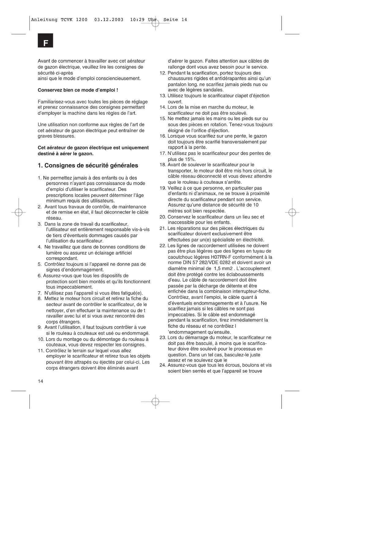 Anleitung TCVK 1200 03.12.2003 10:29 Uhr Seite 13Avant de commencer à travailler avec cet aérateur de gazon électrique, veuillez lire les consignes de sécurité ci-après ainsi que le mode d’emploi consciencieusement. Conservez bien ce mode d’emploi ! Familiarisez-vous avec toutes les pièces de réglage et prenez connaissance des consignes permettant d’employer la machine dans les règles de l’art. Une utilisation non conforme aux règles de l’art de cet aérateur de gazon électrique peut entraîner de graves blessures. Cet aérateur de gazon électrique est uniquement destiné à aérer le gazon.