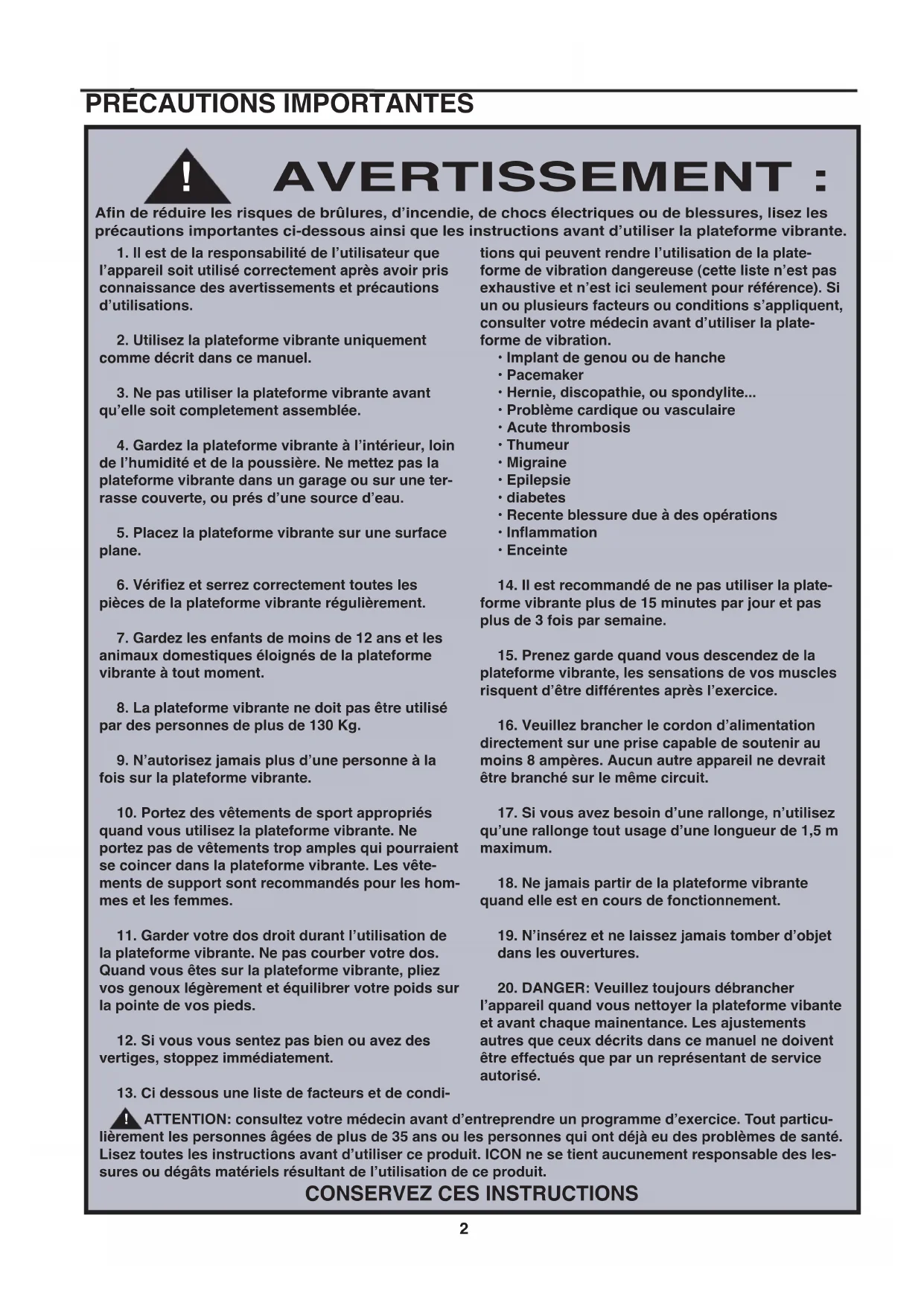 ATTENTION: consultez votre médecin avant d'entrepreneure un programme d'exercice. Tout particulièrement les personnes âgées de plus de 35 ans ou les personnes qui ont déjà eu des problèmes de santé. Lisez toutes les instructions avant d'utiliser ce produit. ICON ne se tient aucunement responsable des les suures ou dégats matériels resultant de l'utilisation de ce produit.