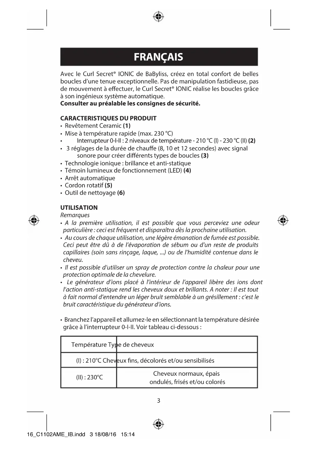 - Branchez l’appareil et allumez-le en sélectionnant la température désirée grâce à l’interrupteur 0-I-II. Voir tableau ci-dessous : Température Type de cheveux (I) : 210°C Cheveux ns, décolorés et/ou sensibilisés (II) : 230°C Cheveux normaux, épais ondulés, frisés et/ou colorés 16_C1102AME_IB.indd 3 18/08/16 15:144