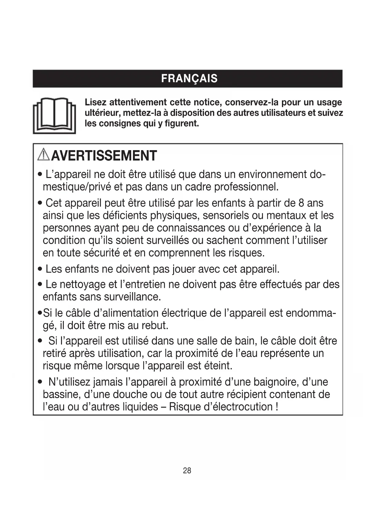 N’utilisez jamais l’appareil à proximité d’une baignoire, d’une bassine, d’une douche ou de tout autre récipient contenant de l’eau ou d’autres liquides –Risque d’électrocution! Lisez attentivement cette notice, conservez-la pour un usage ultérieur, mettez-la à disposition des autres utilisateurs et suivez les consignes qui y figurent.28 29