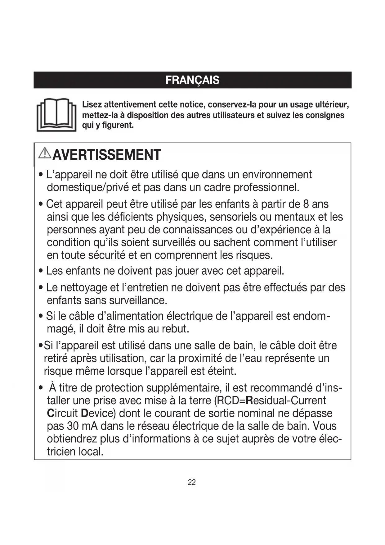 - L’appareil ne doit être utilisé que dans un environnement domestique/privé et pas dans un cadre professionnel.