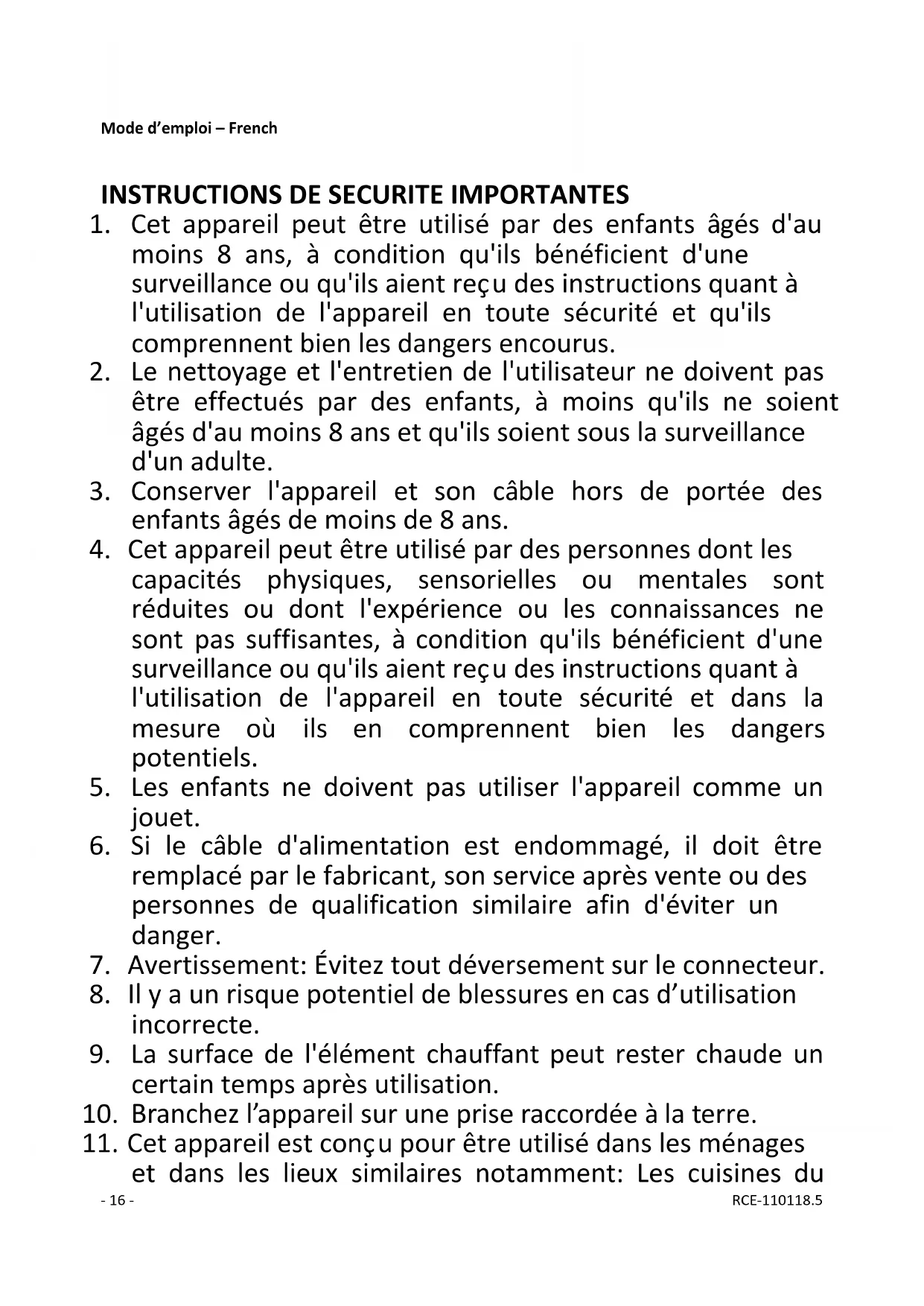 - Le nettoyage et l'entretien de l'appareil ne doit pas être effectué par des enfants, à moins qu'ils ne soient âgés d'au moins 8 ans et qu'ils soient sous la surveillance d'un adulte.