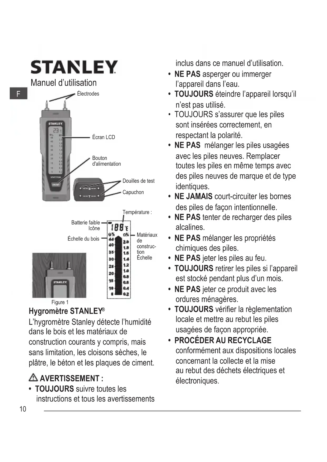 L'hygromètre Stanley détecte l'humidité dans le bois et les matériaux de construction courants y compris, mais sans limitation, les cloisons sèches, le plâtre, le béton et les plaques de ciment.