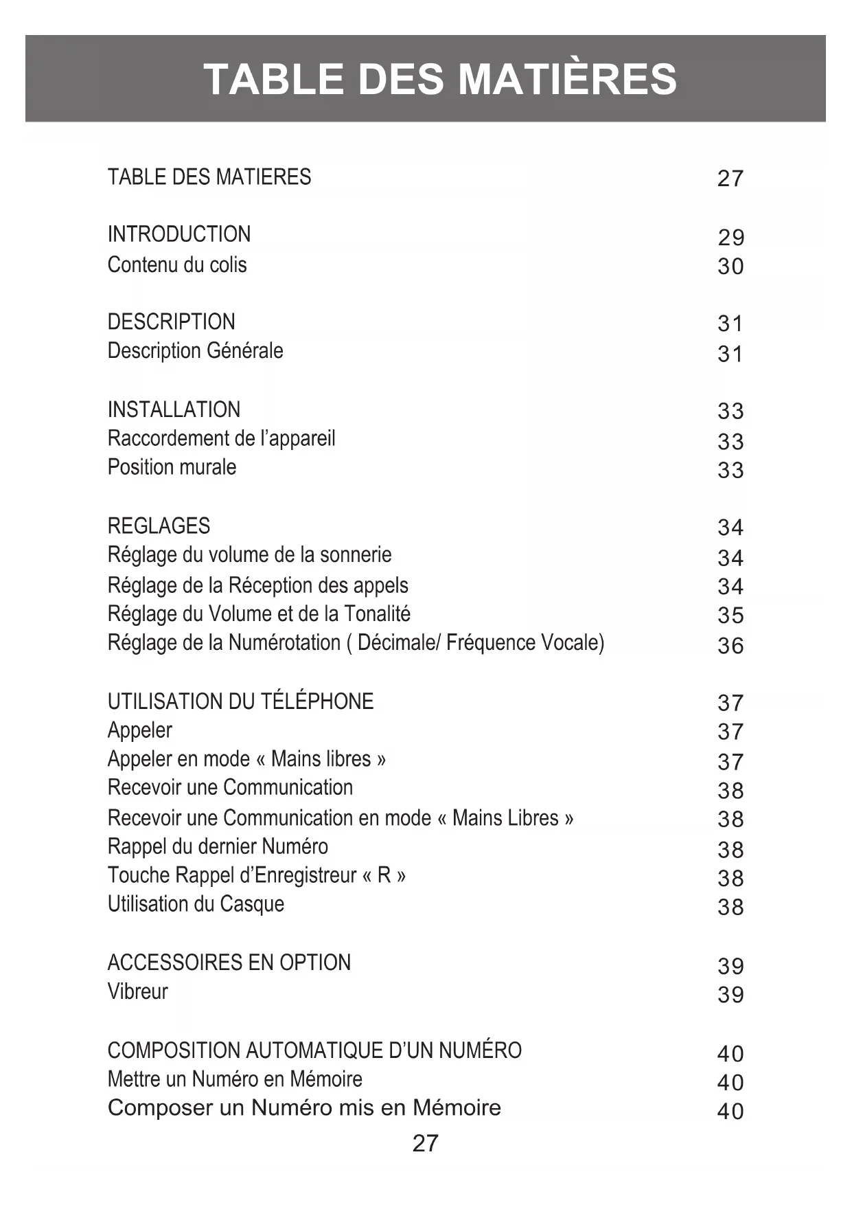 INTRODUCTION Contenu du colis DESCRIPTION Description Générale INSTALLATION Raccordement de l’appareil Position murale REGLAGES Réglage du volume de la sonnerie Réglage de la Réception des appels Réglage du Volume et de la Tonalité Réglage de la Numérotation ( Décimale/ Fréquence Vocale)