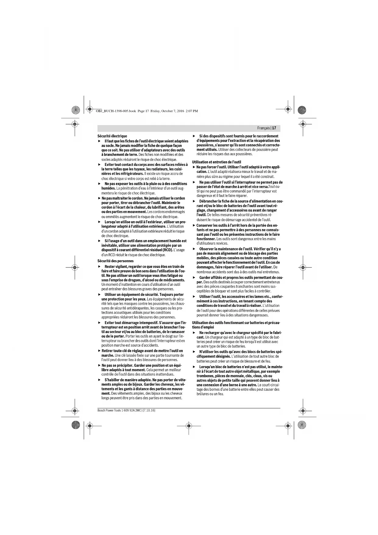 - selon l’accumulateur utilisé Henk Becker Executive Vice President Engineering Helmut Heinzelmann Head of Product Certification PT/ECS OBJ_BUCH-1398-005.book Page 19 Friday, October 7, 2016 2:07 PM20 | Français 1 609 92A 2MC | (7.10.16) Bosch Power Tools Retirer l’accu L’accu 1 dispose de 2 positions de verrouillage qui doivent éviter que l’accu puisse sortir si l’on appuie sur la touche de déverrouillage de l’accu 10 par mégarde. Tant que l’accu reste en place dans l’outil électroportatif, un ressort le maintient en position. Pour sortir l’accu 1, appuyez sur la touche de déverrouillage 10 et sortez l’accu par l’avant de l’outil électroportatif. Ne for- cez pas. Voyant lumineux indiquant l’état de charge de l’accu (voir figure A) Les trois LED vertes du voyant lumineux 16 indiquent l’état de charge de l’accu 1. Pour des raisons de sécurité, l’interroga- tion de l’état de charge n’est possible que quand l’outil élec- troportatif est à l’arrêt. Appuyez sur la touche 15 pour indiquer l’état de charge. Ceci est possible même si l’accu 1 a été retiré. Si aucune LED n’est allumée après que la touche 15 a été ap- puyée, l’accu est défectueux et doit être remplacé. Montage/remplacement de la lame de scie à ruban Portez toujours des gants de protection pour monter la lame de scie à ruban. Risque de blessure en cas de contact avec la lame de la scie à ruban. Porter toujours des lunettes de protection. Des lunettes de protection réduisent le risque de blessures. Sélection de la lame de scie à ruban Vous trouverez un tableau des lames de scie à ruban recom- mandées à la fin de cette notice d’utilisation. Montage de la lame de scie à ruban (voir figures B –E) Desserrez les deux vis 12 et enlevez les capots 11. Faites pi- voter le levier 8 de 180° dans le sens de rotation jusqu’à la butée. Introduisez la lame de scie à ruban 6 successivement dans les guidages de la lame de scie 13. Le dos de la lame de scie doit entrer en contact avec les paliers se trouvant dans la partie in- férieure des guidages de la lame de scie 13. Passez la lame de scie à ruban 6 successivement autour des deux rouleaux de la lame de scie 17. Faites pivoter le levier 8 de 180° dans le sens de rotation jusqu’à la butée. Vérifiez si la lame de scie à ruban 6 est posi- tionnée correctement autour des deux rouleaux 17. Montez les capots 11 et serrez les deux vis 12. Contrôlez la bonne position de la lame de scie à ruban
