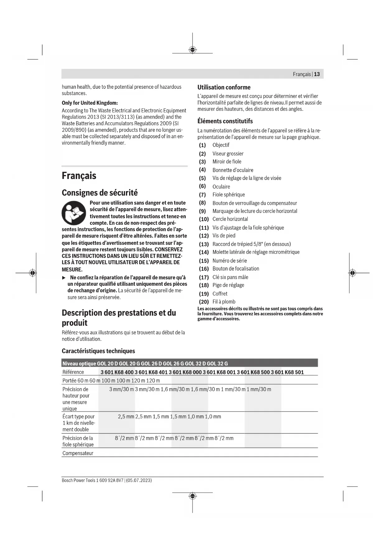 , il faut régler la valeur 1,476m. Contrôlez à nouveau le réticule.Répétez si nécessaire la pro- cédure d’ajustage ou adressez-vous au service après-vente Bosch. 1 609 92A 8V7 | (05.07.2023) Bosch Power ToolsEspañol | 17 Entretien et Service après‑vente Nettoyage et entretien Ne rangez et ne transportez l’appareil de mesure que dans le coffret fourni. Maintenez l’appareil de mesure propre. N’immergez jamais l’appareil de mesure dans de l’eau ou dans d’autres liquides. Nettoyez l’appareil à l’aide d’un chiffon doux et humide. N’utilisez pas de détergents ou de solvants. Prenez particulièrement soin des lentilles. Ne retirez la pous- sière qu’avec un chiffon doux. Ne touchez pas les lentilles avec les doigts. Laissez sécher complètement l’appareil de mesure et son coffret avant de les ranger. Dans le coffret se trouve un sa- chet de gel de silice servant à absorber l’humidité. Pensez à remplacer régulièrement le sachet de gel de silice par un sa- chet neuf. Si l’appareil doit être réparé, renvoyez-le dans son coffret. Service après-vente et conseil utilisateurs Notre Service après-vente répond à vos questions concer- nant la réparation et l’entretien de votre produit et les pièces de rechange. Vous trouverez des vues éclatées et des infor- mations sur les pièces de rechange sur le site : www.bosch-pt.com L’équipe de conseil utilisateurs Bosch se tient à votre dispo- sition pour répondre à vos questions concernant nos pro- duits et leurs accessoires. Pour toute demande de renseignement ou toute commande de pièces de rechange, précisez impérativement la réfé- rence à 10chiffres figurant sur l’étiquette signalétique du produit. France Réparer un outil Bosch n’a jamais été aussi simple, et ce, en moins de 5 jours, grâce à SAV DIRECT, notre formulaire de retour en ligne que vous trouverez sur notre site internet www.bosch-pt.fr à la rubrique Services. Vous y trouverez également notre boutique de pièces détachées en ligne où vous pouvez passer directement vos commandes. Vous êtes un utilisateur, contactez : Le Service Clientèle Bosch Outillage Electroportatif Tel.: 0970821226 (Numéro non surtaxé au prix d'un ap- pel local) E-Mail: sav.outillage-electroportatif@fr.bosch.com Vous êtes un revendeur, contactez: Robert Bosch (France) S.A.S. Service Après-Vente Electroportatif 126, rue de Stalingrad 93705 DRANCY Cédex Tel.: (01) 43119006 E-Mail: sav-bosch.outillage@fr.bosch.com Vous trouverez d'autres adresses du service après-vente sous: www.bosch-pt.com/serviceaddresses Élimination des déchets Prière de rapporter les instruments de mesure, leurs acces- soires et les emballages dans un Centre de recyclage respec- tueux de l’environnement. Seulement pour les pays de l’UE : Conformément à la directive européenne 2012/19/UE rela- tive aux déchets d’équipements électriques et électroniques (DEEE) et sa transposition dans le droit national français, les appareils de mesure devenus inutilisables et conformément à la directive 2006/66/CE les piles/accus défectueux ou usagés doivent être mis de côté et rapportés dans un centre de collecte et de recyclage respectueux de l’environnement. En cas de non-respect des consignes d’élimination, les dé- chets d’équipements électriques et électroniques peuvent avoir un impact négatif sur l’environnement et la santé des personnes du fait des substances dangereuses qu’ils contiennent. Valable uniquement pour la France: Español Indicaciones de seguridad Leer y observar todas las instrucciones, pa- ra trabajar sin peligro y riesgo con el apara- to de medición. Si el aparato de medición no se utiliza según las presentes instrucciones, pueden menoscabarse las medidas de seguridad integra- das en el aparato de medición. Jamás desvirtúe las seña- les de advertencia del aparato de medición. GUARDE BIEN ESTAS INSTRUCCIONES Y ADJUNTELAS EN LA EN- TREGA DEL APARATO DE MEDICIÓN. u Sólo deje reparar el aparato de medición por personal técnico calificado y sólo con repuestos originales. So- lamente así se mantiene la seguridad del aparato de medi- ción. Descripción del producto y servicio Por favor, observe las ilustraciones en la parte inicial de las instrucciones de servicio. Utilización reglamentaria El aparato de medición ha sido diseñado para determinar y comprobar exactamente los gradientes de altura horizonta- les.También es adecuado para medir alturas, distancias y án- gulos. Bosch Power Tools 1 609 92A 8V7 | (05.07.2023)18 | Español Componentes principales La numeración de los componentes está referida a la imagen del aparato de medición en la página ilustrada. (1) Objetivo (2) Mira gruesa (3) Espejo de burbuja (4) Cubierta del ocular (5) Tornillo de ajuste de la línea visual (6) Ocular (7) Nivel de burbuja circular (8) Botón de bloqueo del compensador (9) Marca de lectura del círculo horizontal (10) Círculo horizontal (11) Tornillo de ajuste del nivel de burbuja circular (12) Tornillo de pie (13) Alojamiento del trípode 5/8" (en el lado inferior) (14) Accionamiento fino lateral (15) Número de serie (16) Botón de enfoque (17) Llave macho hexagonal (18) Mandril de ajuste (19) Maleta (20) Plomada Los accesorios descritos e ilustrados no corresponden al material que se adjunta de serie. La gama completa de accesorios opciona- les se detalla en nuestro programa de accesorios. Datos técnicos Nivelador ópti-