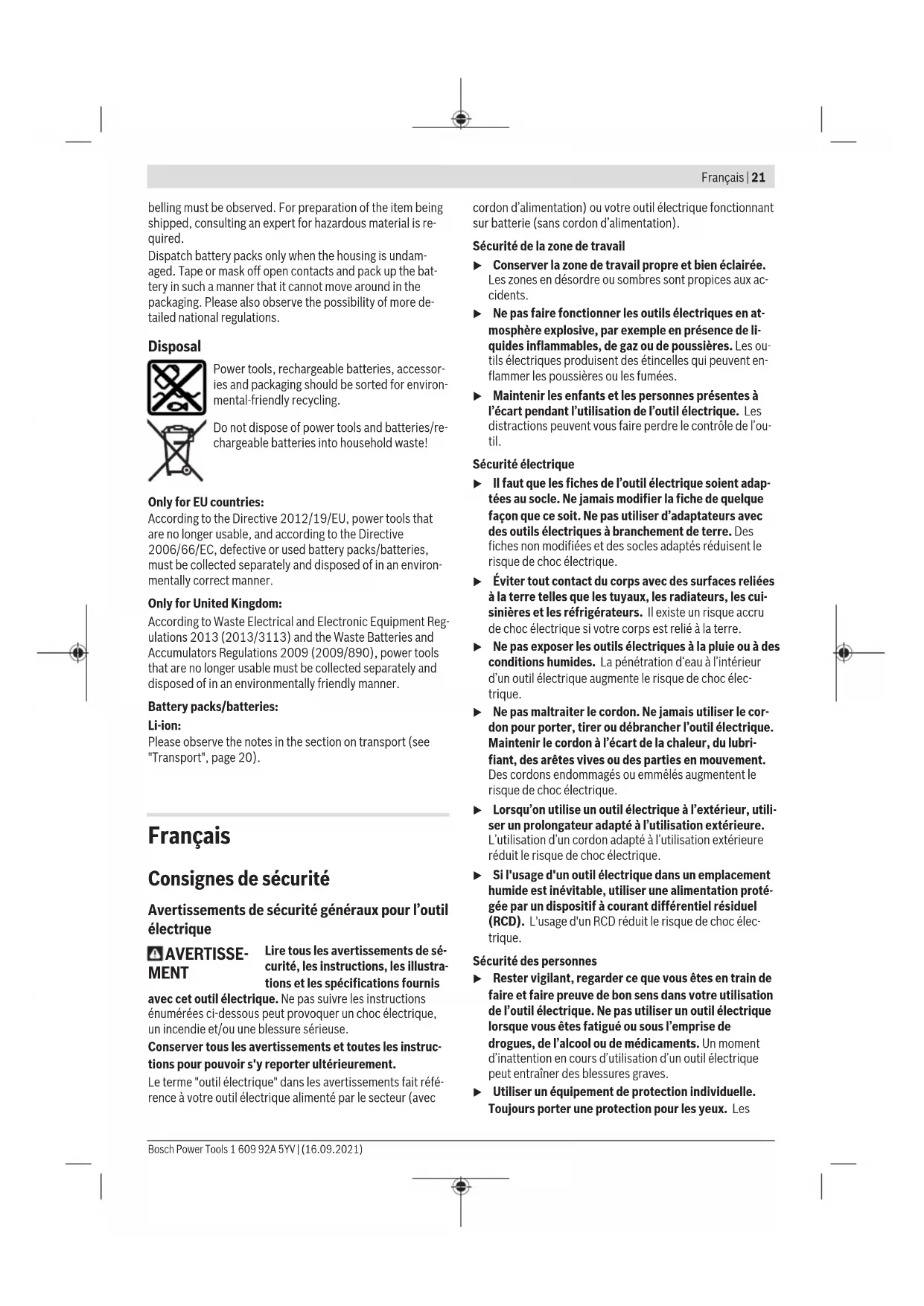 The cut mark (12) indicates the position of the saw blade when making a right-angled cut. For a precise cut, place the circular saw against the work- piece as shown in the figure. We recommend making a test cut. Utility hook (see figure C) Your power tool is equipped with a utility hook (3) for hanging it to a ladder, for example. Simply fold out the utility hook (3) to the required position. u When the power tool is hanging by the utility hook, en- sure that the saw blade is protected against uninten- ded contact in order to prevent injury. Fold the utility hook (3) in again when you want to begin work with the power tool. Chip container (see figuresF–G) Caution: Do not touch the protective guard with chip container(2) and the metal chips with bare hands immedi- ately after operation. These parts can be very hot and cause skin burns. Do not cut material which has had thinner, petrol, grease or other chemicals applied to it. The metal chips produced by such materials could damage the protective guard with chip container(2) and lead to a break that could cause personal injury. The metal chips are collected in the chip container of the protective guard(2). Empty the chip container at regular in- tervals. To do this, push the chip container locking mechanism(25) upwards. Open the lid of the chip container(24) and tilt the power tool sideways to empty the chip container. After emptying, close the lid of the chip container(24) and lock the chip container again. Start-up u Before carrying out any work with the power tool, en- sure that the chip container is closed and locked. Never operate the power tool without a protective guard/with a defective protective guard/lid on the chip container. Inserting the battery Push the charged battery (9) into the power tool until the battery is securely locked. Bosch Power Tools 1 609 92A 5YV | (16.09.2021)20 | English Switching on/off u Make sure that you are able to press the On/Off switch without releasing the handle. To start the power tool, first press the lock-off switch (6), then press and hold the on/off switch (7). To switch off the power tool, release the on/off switch (7). Note: For safety reasons, the on/off switch (7) cannot be locked; it must remain pressed during the entire operation. Run-out brake An integrated run-out brake shortens the time the saw blade keeps running for after the power tool has been switched off. Protection Against Deep Discharging The lithium-ion battery is protected against deep discharge by the Electronic Cell Protection (ECP). When the battery is discharged, the power tool is switched off by means of a pro- tective circuit: The application tool no longer rotates. Switching on the LED worklight The lamp (26) lights up when the on/off switch (7) is lightly or fully pressed, meaning that the work area is illuminated in poor lighting conditions. Practical advice u Remove the battery from the power tool before carry- ing out work on the power tool (e.g. maintenance, changing tool, etc.). The battery should also be re- moved for transport and storage. There is risk of injury from unintentionally pressing the on/off switch. The width of cut varies depending on the saw blade used. Protect saw blades against shock and impact. Guide the power tool evenly, pushing it gently in the cutting direction. Applying too much pressure to the power tool when moving it in the cutting direction significantly reduces the service life of the application tools and can damage the power tool. The sawing performance and the quality of the cut essen- tially depend on the condition and the tooth shape of the saw blade. This is why you should only use sharp saw blades that are suitable for the material being machined. Sawing with the parallel guide (see figure D) The parallel guide (14) allows you to make precise cuts along the edge of a workpiece and cut strips with the same dimensions. Sawing with an auxiliary guide (see figure E) For working on large workpieces or for cutting straight edges, you can securely fasten a board or rail to the work- piece as an auxiliary guide. The circular saw can be guided along the path of this auxiliary guide with the base plate. Recommendations for Optimal Handling of the Battery Protect the battery against moisture and water. Only store the battery within a temperature range of −20 to 50°C. Do not leave the battery in your car in the summer, for example. Occasionally clean the ventilation slots on the battery using a soft brush that is clean and dry. A significantly reduced operating time after charging indic- ates that the battery has deteriorated and must be replaced. Follow the instructions on correct disposal. Maintenance and Service Maintenance and Cleaning u Remove the battery from the power tool before carry- ing out work on the power tool (e.g. maintenance, changing tool, etc.). The battery should also be re- moved for transport and storage. There is risk of injury from unintentionally pressing the on/off switch. u To ensure safe and efficient operation, always keep the power tool and the ventilation slots clean. u Replace the lid on the chip container(24) in case of damage. The retracting blade guard must always be able to move freely and retract automatically. It is therefore important to keep the area around the retracting blade guard clean at all times. Remove dust and chips with a paintbrush. After-Sales Service and Application Service Our after-sales service responds to your questions concern- ing maintenance and repair of your product as well as spare parts. You can find explosion drawings and information on spare parts at: www.bosch-pt.com The Bosch product use advice team will be happy to help you with any questions about our products and their accessor- ies. In all correspondence and spare parts orders, please always include the 10‑digit article number given on the nameplate of the product. Great Britain Robert Bosch Ltd. (B.S.C.) P.O. Box 98 Broadwater Park North Orbital Road Denham Uxb