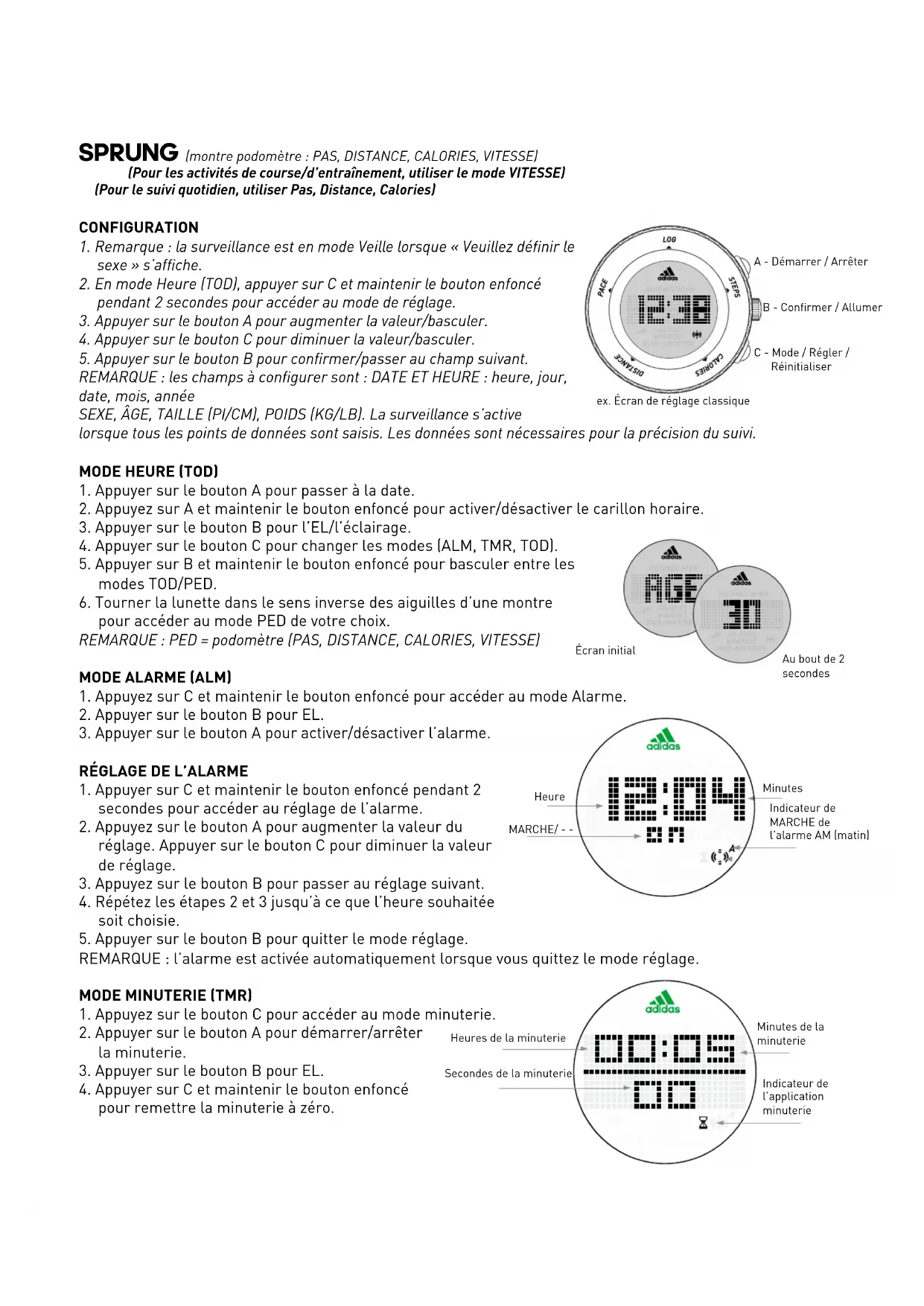 SPRUNG (montre podomètre : PAS, DISTANCE, CALORIES, VITESSE) (Pour les activités de course/d’entraînement, utiliser le mode VITESSE) (Pour le suivi quotidien, utiliser Pas, Distance, Calories) CONFIGURATION