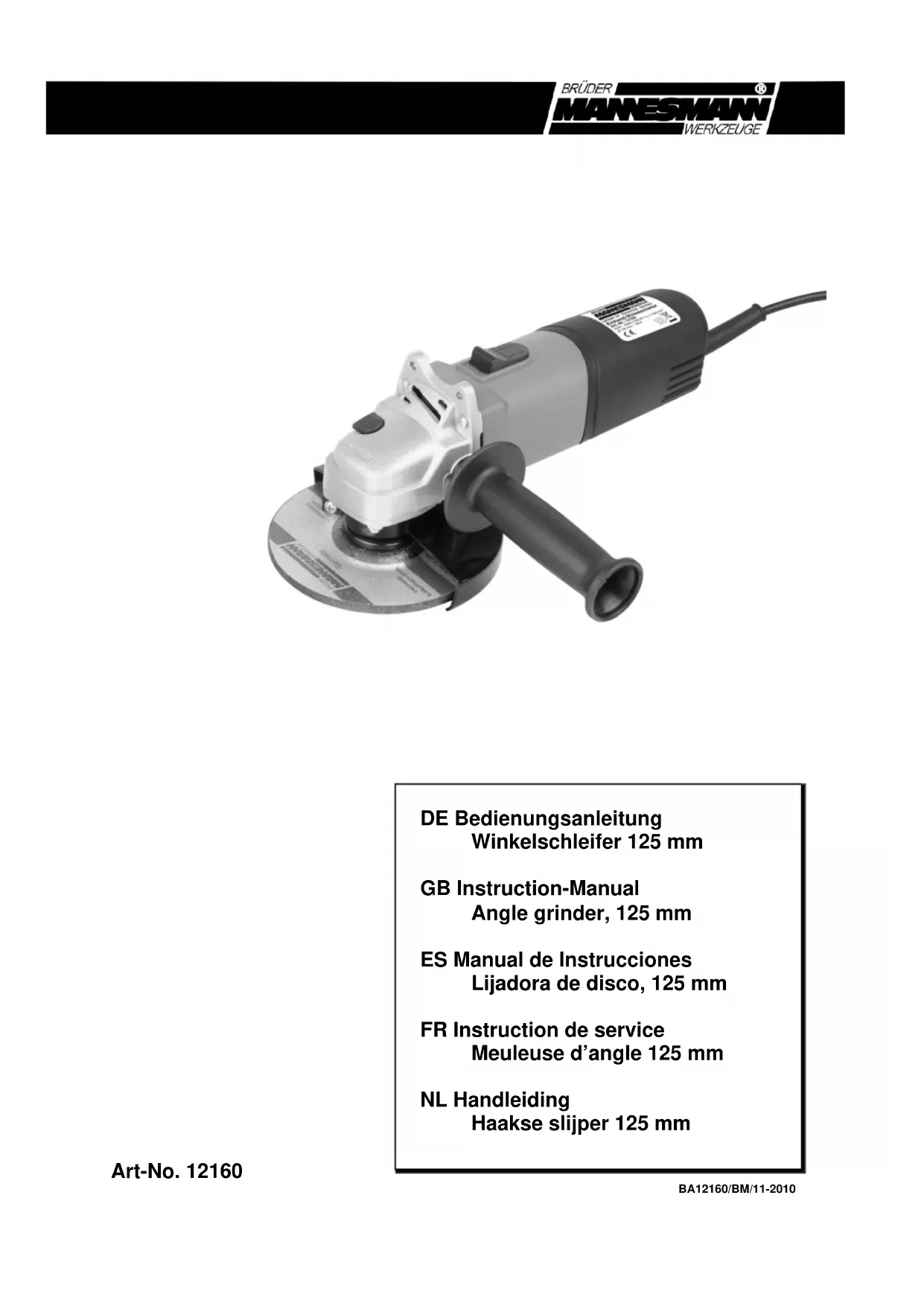 - El símbolo del contenedor tachado representa la obligación de llevar el aparato señalado a un lugar de recogida separada de aparatos eléctricos y electrónicos para su reciclaje. Si tiene alguna duda diríjase a su comerciante BRÜDER MANNESMANNFR - 20 Meuleuse d’angle 125 mm Art. n° 12160 M O D E D’E M P L O I AVERTISSEMENT Veuillez lire l'ensemble des consignes de sécurité et des instruc- tions. Le non-respect des consig- nes de sécurité et des instructions peut causer des électrocutions, des incendies et/ou de graves blessures. Conservez toutes les consignes de sécu- rité et les instructions. Utilisation conforme Cette machine sert à poncer et couper la pierre et le métal avec le disque de ponçage ou de tronçonnage adapté. La machine est livrée avec un capot de protection qui est exclusivement prévu pour les travaux de ponçage. Si vous souhaitez couper du métal ou de la pierre avec cet appareil, un capot de protection spécial pour le tronçonnage doit être installé. Vous trouverez ce capot dans les magasins spécialisés ou grâce à notre adresse de service. Consignes de sécurité supplémen- taires pour la meuleuse d’angle
