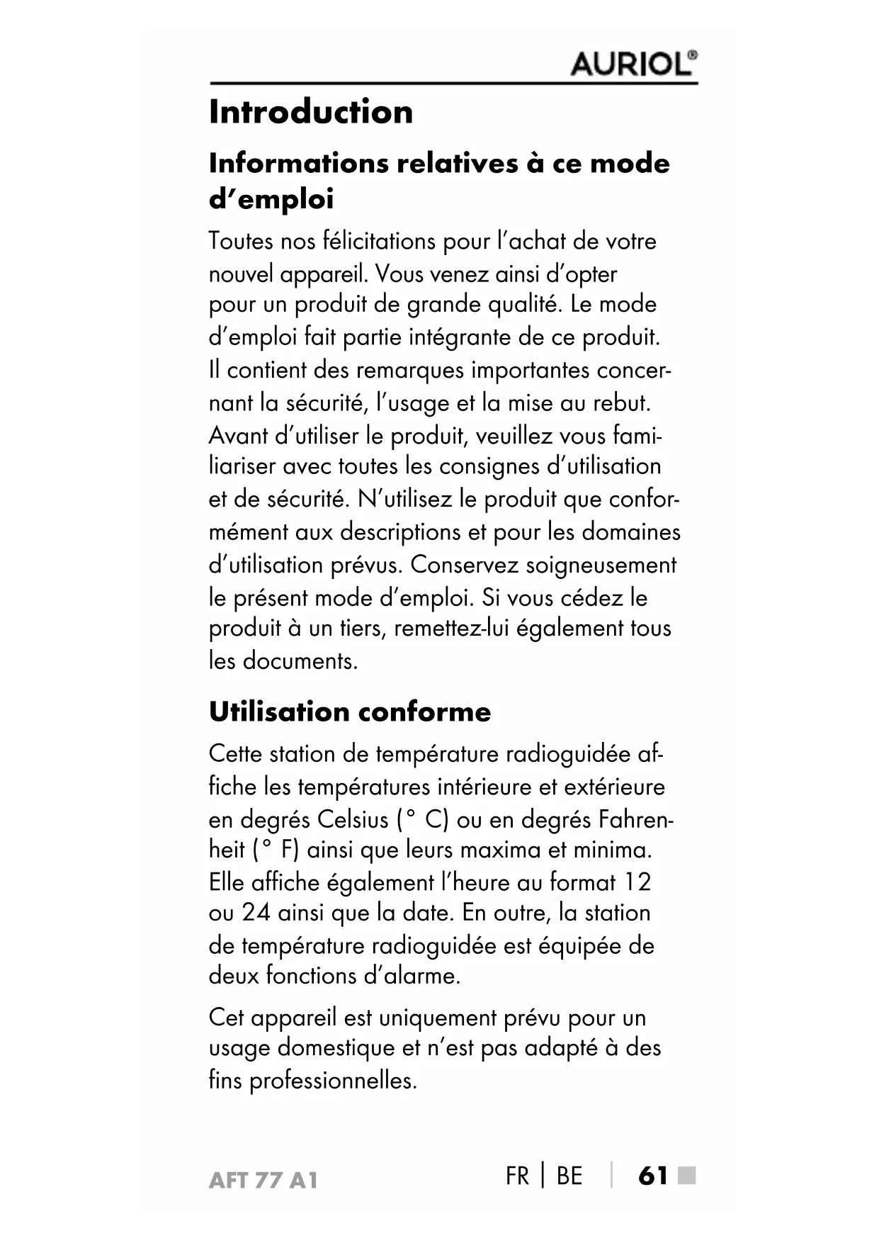 61 ■ Introduction Informations relatives à ce mode d’emploi Toutes nos félicitations pour l’achat de votre nouvel appareil. Vous venez ainsi d’opter pour un produit de grande qualité. Le mode d’emploi fait partie intégrante de ce produit. Il contient des remarques importantes concer- nant la sécurité, l’usage et la mise au rebut. Avant d’utiliser le produit, veuillez vous fami- liariser avec toutes les consignes d’utilisation et de sécurité. N’utilisez le produit que confor- mément aux descriptions et pour les domaines d’utilisation prévus. Conservez soigneusement le présent mode d’emploi. Si vous cédez le produit à un tiers, remettez-lui également tous les documents. Utilisation conforme Cette station de température radioguidée af- fiche les températures intérieure et extérieure en degrés Celsius (° C) ou en degrés Fahren- heit (° F) ainsi que leurs maxima et minima. Elle affiche également l’heure au format 12 ou 24 ainsi que la date. En outre, la station de température radioguidée est équipée de deux fonctions d’alarme. Cet appareil est uniquement prévu pour un usage domestique et n’est pas adapté à des fins professionnelles.AFT 77 A1 ■ 62