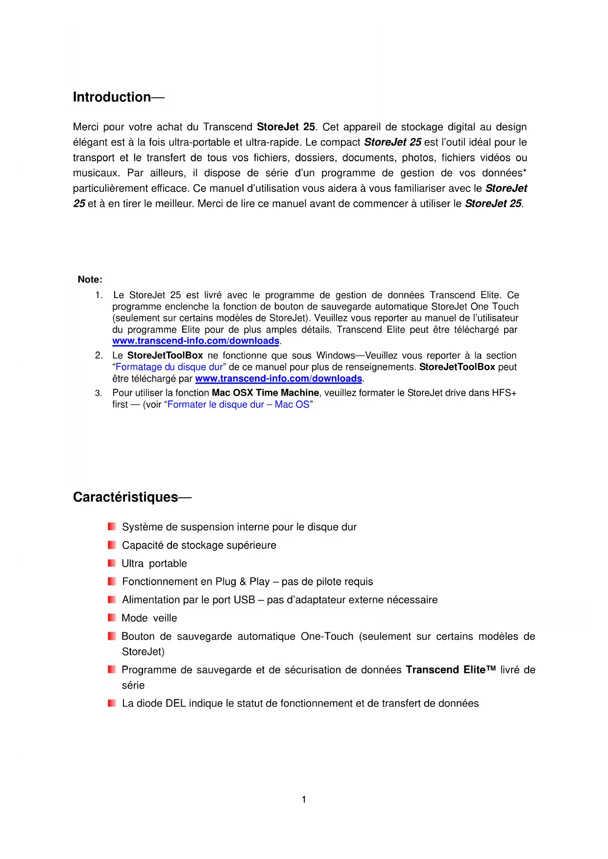 - Garantie Limitée 3 Ans︱ Introduction︱ Merci pour votre achat du Transcend StoreJet 25. Cet appareil de stockage digital au design élégant est à la fois ultra-portable et ultra-rapide. Le compact StoreJet 25 est l’outil idéal pour le transport et le transfert de tous vos fichiers, dossiers, documents, photos, fichiers vidéos ou musicaux. Par ailleurs, il dispose de série d’un programme de gestion de vos données* particulièrement efficace. Ce manuel d’utilisation vous aidera à vous familiariser avec le StoreJet 25 et à en tirer le meilleur. Merci de lire ce manuel avant de commencer à utiliser le StoreJet 25. p. 201