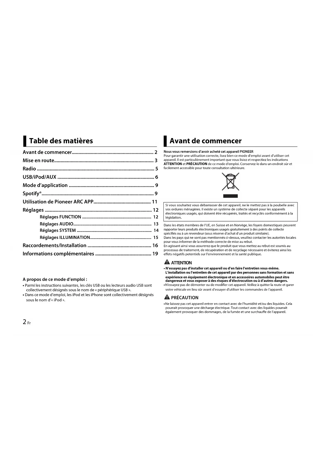 - Dans ce mode d’emploi, les iPod et les iPhone sont collectivement désignés sous le nom d’« iPod ». Table des matières Nous vous remercions d’avoir acheté cet appareil PIONEERPour garantir une utilisation correcte, lisez bien ce mode d’emploi avant d’utiliser cet appareil. Il est particulièrement important que vous lisiez et respectiez les indications ATTENTION et PRÉCAUTION de ce mode d’emploi. Conservez-le dans un endroit sûr et facilement accessible pour toute consultation ultérieure.Dans les états membres de l’UE, en Suisse et en Norvège, les foyers domestiques peuvent rapporter leurs produits électroniques usagés gratuitement à des points de collecte spécifiés ou à un revendeur (sous réserve d’achat d’un produit similaire). Dans les pays qui ne sont pas mentionnés ci-dessus, veuillez contacter les autorités locales pour vous informer de la méthode correcte de mise au rebut.En agissant ainsi vous assurerez que le produit que vous mettez au rebut est soumis au processus de traitement, de récupération et de recyclage nécessaire et éviterez ainsi les effets négatifs potentiels sur l’environnement et la santé publique. ATTENTION