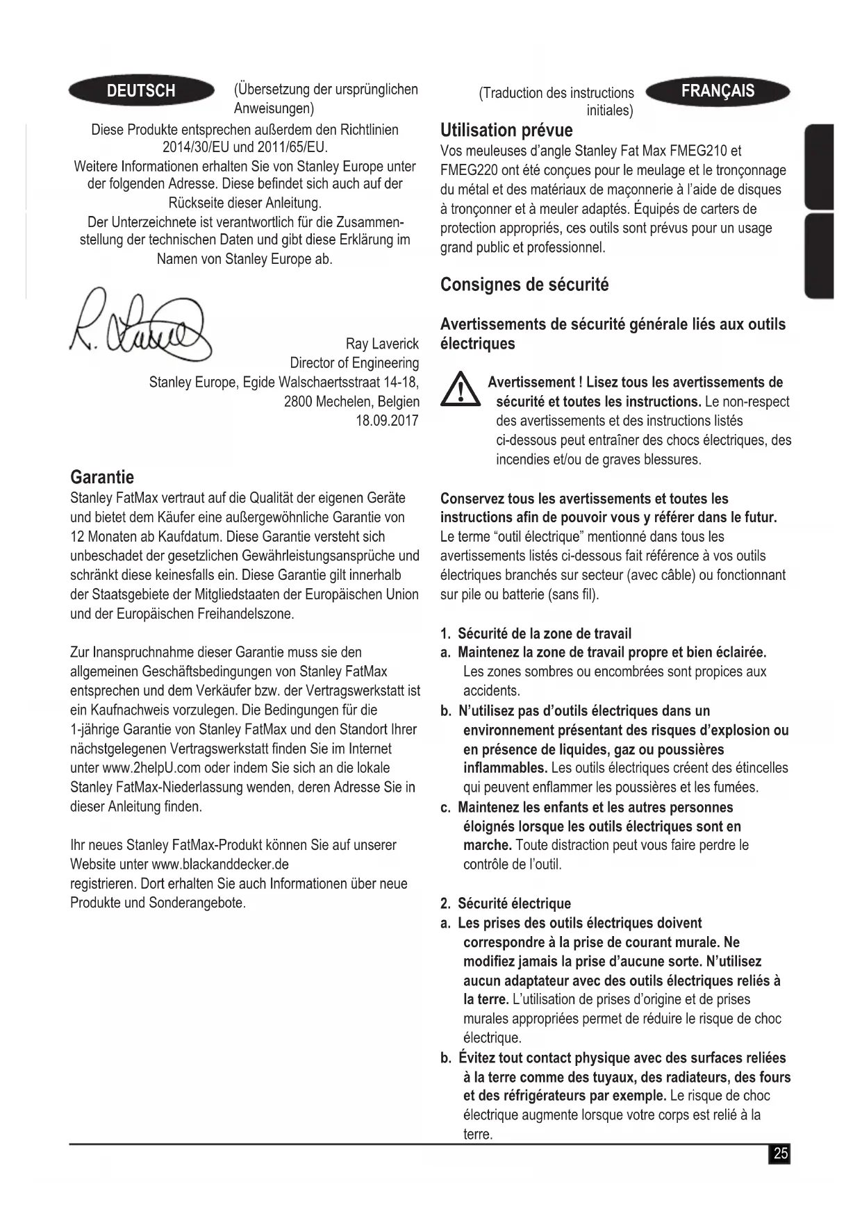 Meuleuse d’angle FMEG210, FMEG220 Stanley Europe déclare que les produits décrits dans les «Caractéristiques techniques» sont conformes aux normes : 2006/42/CE, EN 60745-1:2009 +A11:2010 ; EN 60745-2-3:2011 + A2:2013 + A11:2014 + A12:2014 + A13:2015 Ces produits sont également conformes aux Directives 2014/30/UE et 2011/65/UE. Pour plus de détails, veuillez contacter Stanley Europe à l’adresse suivante ou vous reporter au dos du manuel. Le soussigné est responsable de la compilation des données de la che technique et fait cette déclaration au nom de Stanley Europe. Ray Laverick Directeur Ingénierie Stanley Europe, Egide Walschaertsstraat14-18, 2800 Mechelen, Belgique 18/09/2017 Garantie Stanley Fat Max est sûr de la qualité de ses produits et offre une garantie de 12 mois aux utilisateurs, à partir de la date d’achat. Cette garantie s’ajoute à vos droits légaux auxquels elle ne porte aucunement préjudice. Cette garantie est valable au sein des territoires des États membres de l’Union Européenne et au sein de la Zone européenne de libre- échange. Pour prétendre à la garantie, la réclamation doit être en conformité avec les conditions générales de Stanley Fat Max et vous devez fournir une preuve d’achat au vendeur ou au réparateur agréé. Les conditions générales de la garantie de 1 an Stanley Fat Max ainsi que l’adresse du réparateur agrée le plus proche sont disponibles sur le site Internet www.2helpU. com ou en contactant votre agence Stanley Fat Max locale à l’adresse indiquée dans ce manuel. Accédez à notre site Internet www.blackanddecker.co.uk pour enregistrer votre nouveau produit Stanley Fat Max et être informé des nouveaux produits et des offres spéciales37 (Traduzione del testo originale) ITALIANO (Traduzione del testo originale)